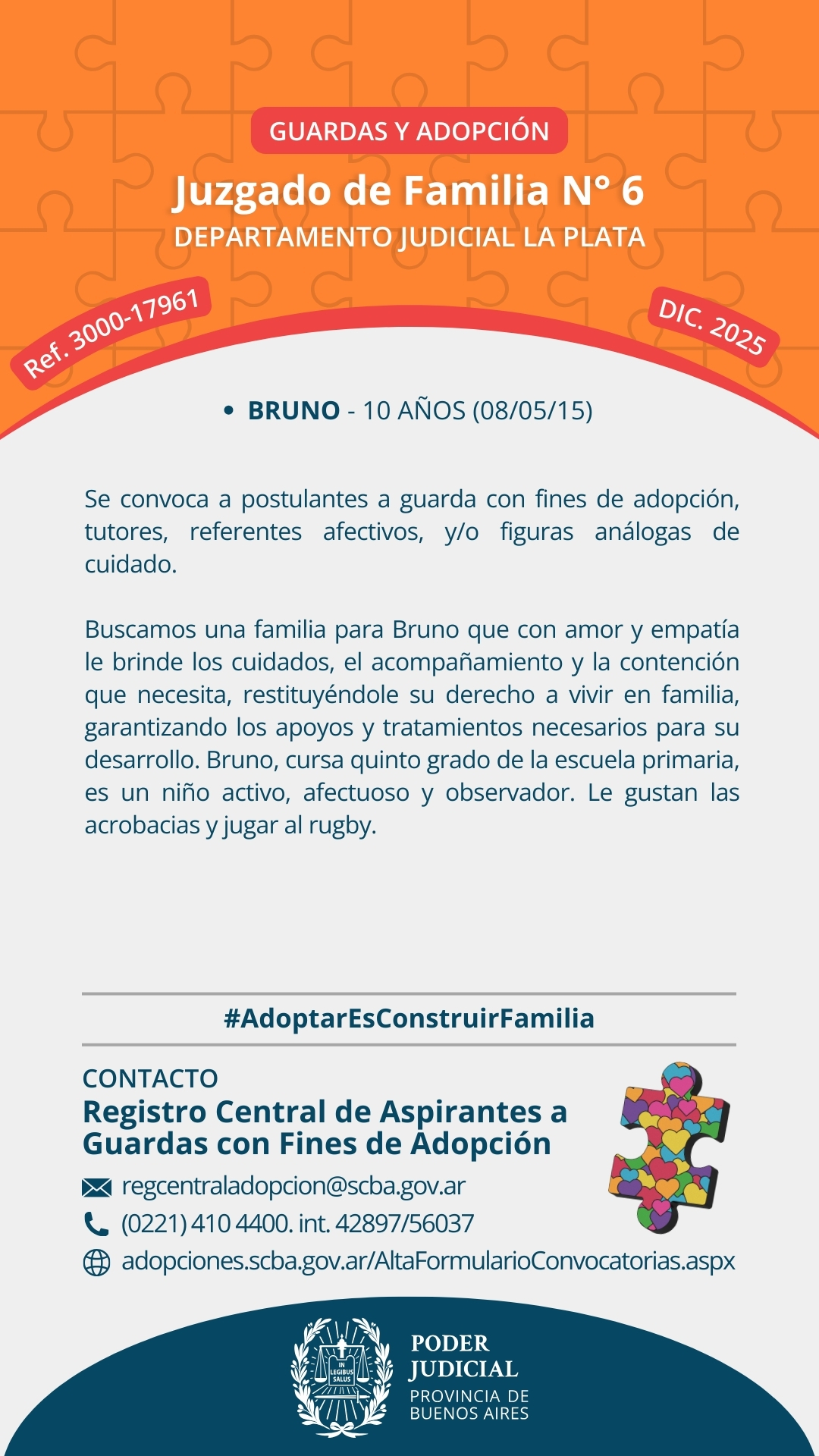 El Juzgado de Familia nº6 del Departamento Judicial La Plata y el Registro Central de Aspirantes a Guarda con Fines de Adopción convocan a postulantes a guarda con fines de adopción y/o personas que quieran ofrecerse como referentes afectivos, tutores o figuras análogas de cuidado para Bruno, de 10 años, nacido el día 8 de mayo de 2015.