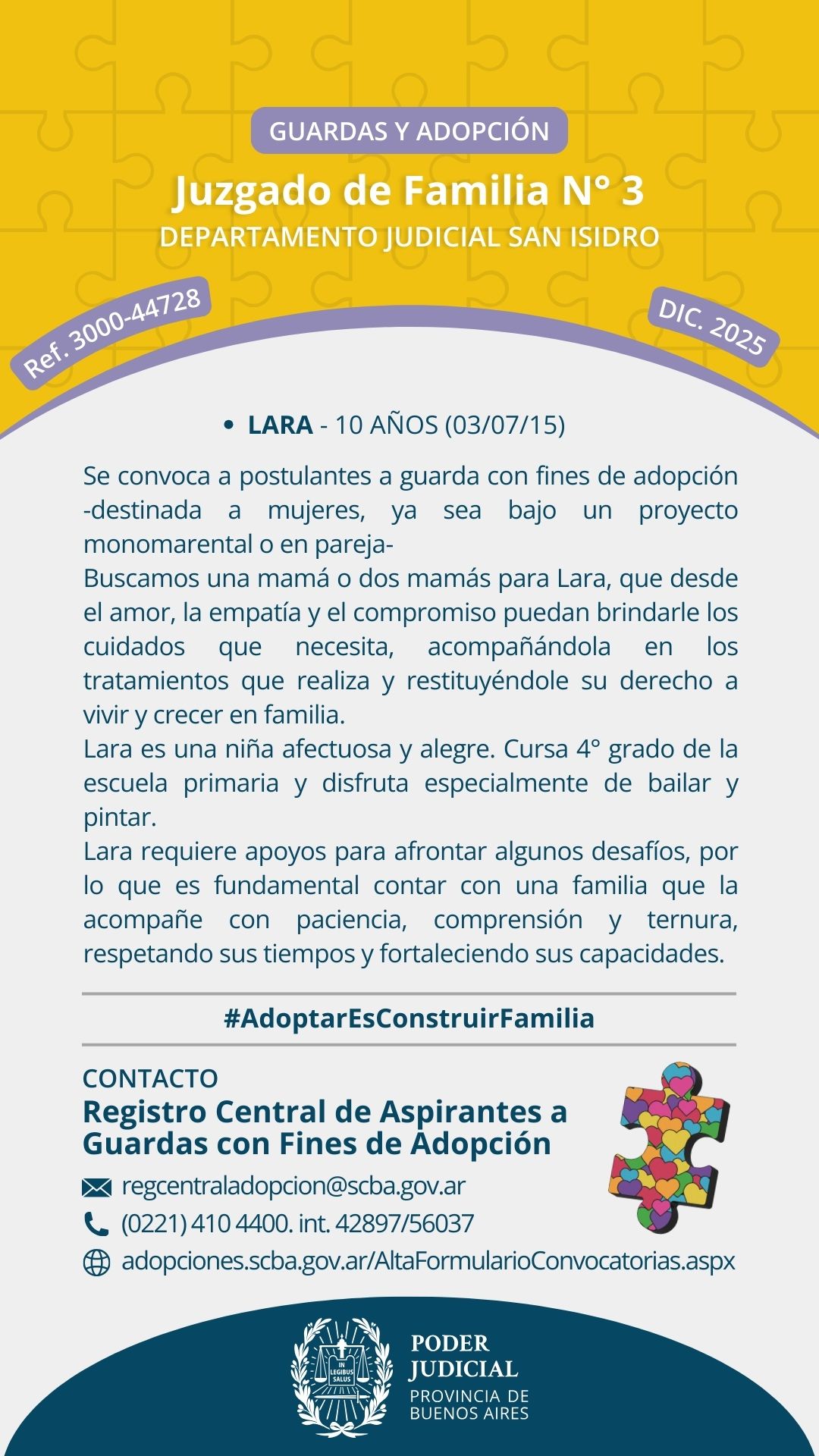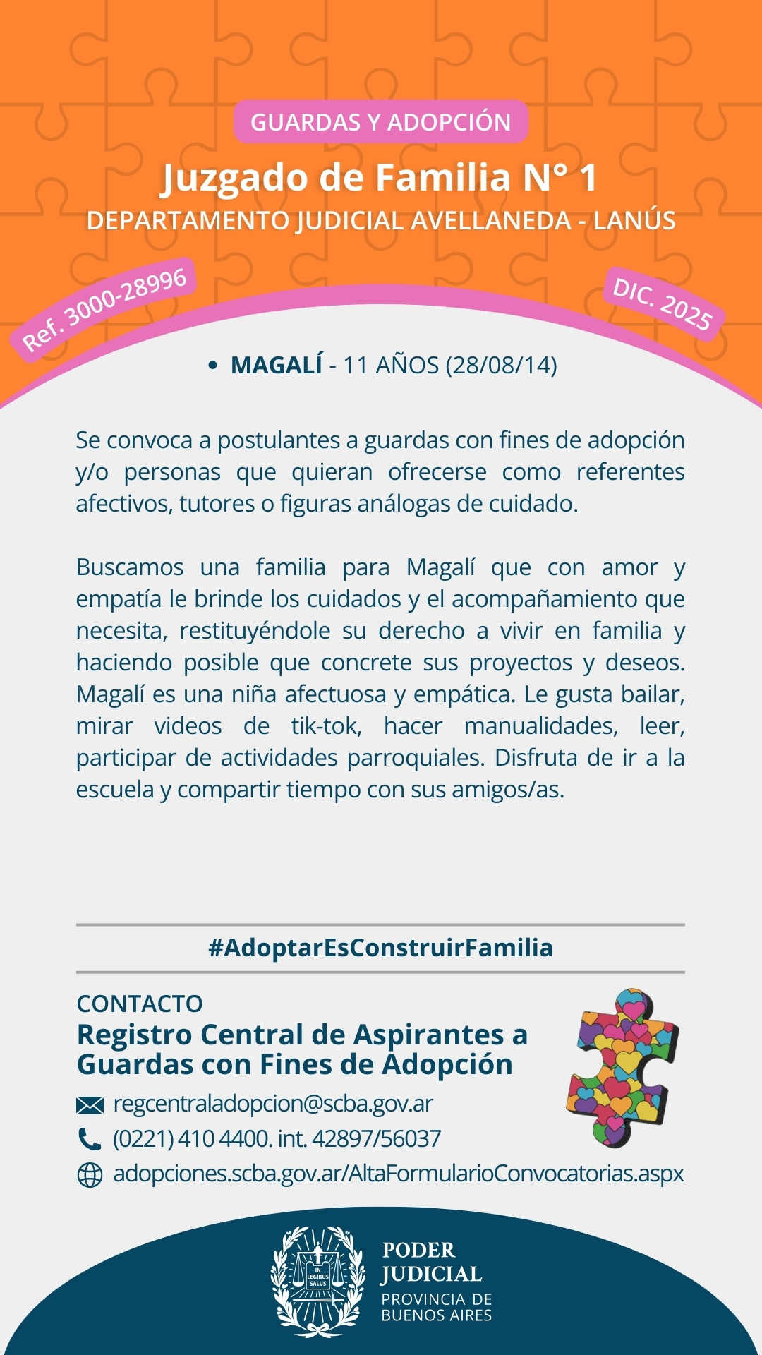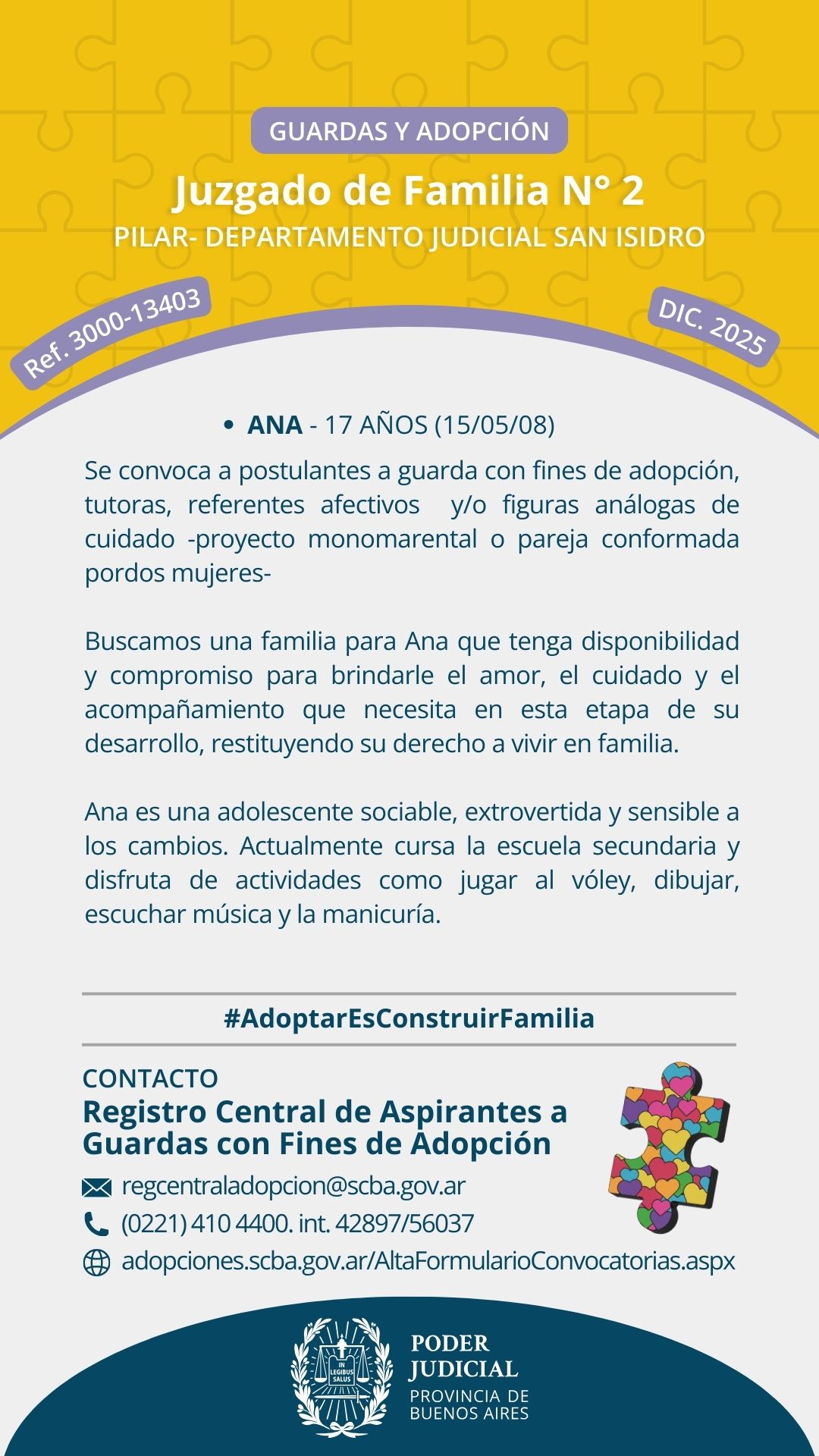 “Las búsquedas de familias por Convocatoria Pública son llamados a personas que se ofrecen para incorporar a sus familias a niños, niñas o adolescentes. Estas personas pueden, o no, estar inscriptas previamente en algún Registro de Adoptantes y tener domicilio en provincia de Buenos Aires o en el resto del país.