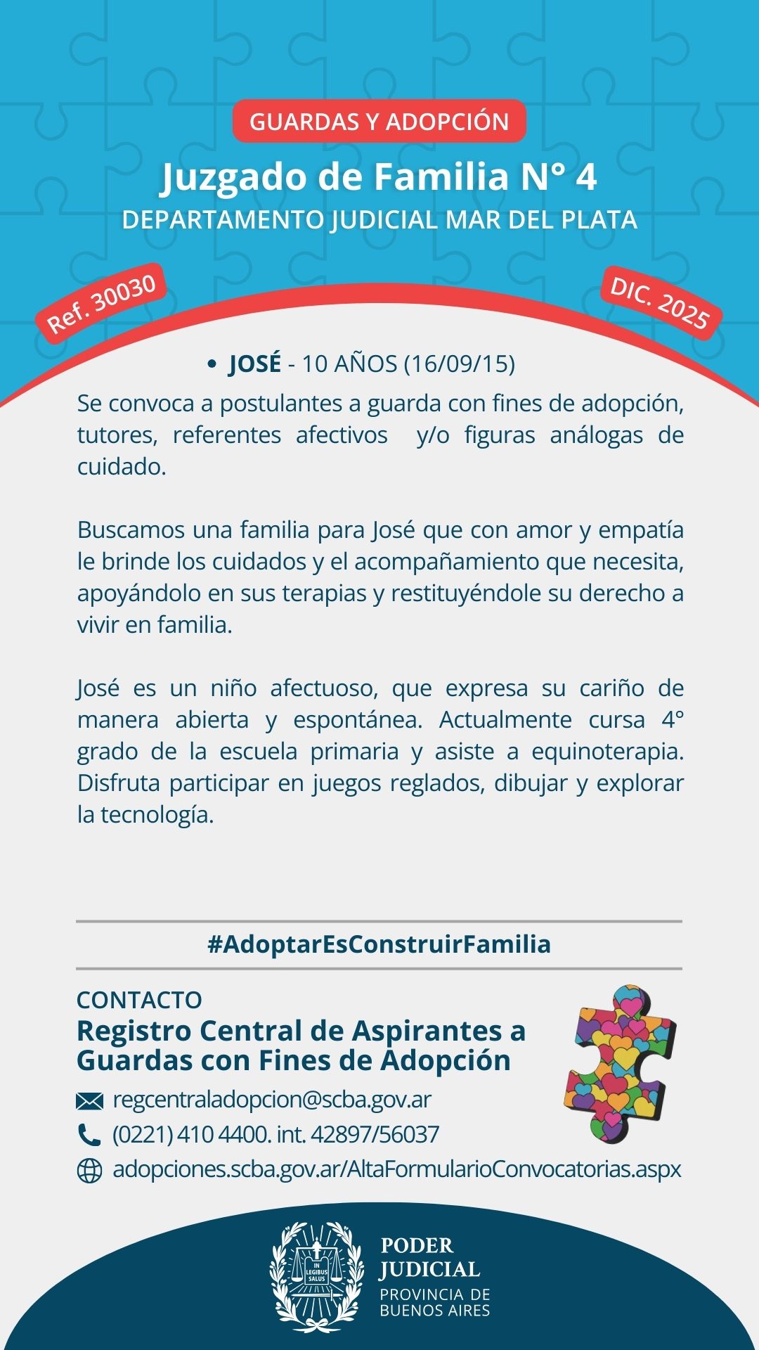 Cabe aclarar que el ofrecimiento e inscripción a una Convocatoria Pública, vale solo y exclusivamente para esa Convocatoria y esos/as niños, niñas o adolescentes en particular. Si las personas desean inscribirse para ser convocados por otros/as niños, niñas o adolescentes indeterminados/as en situación de adoptabilidad, deben inscribirse en el Registro Central de Aspirantes a Guardas con fines de Adopción por medio de este formulario. Completar un formulario respondiendo a una Convocatoria Pública es, ni más ni menos, que un ofrecimiento a cuidar, amar y acompañar a un niño, niña o adolescente con derechos vulnerados. Dada la importancia que reviste, solicitamos completar un formulario por vez para evitar superposiciones y sostener el compromiso con la búsqueda de familia para la que realizan el ofrecimiento.