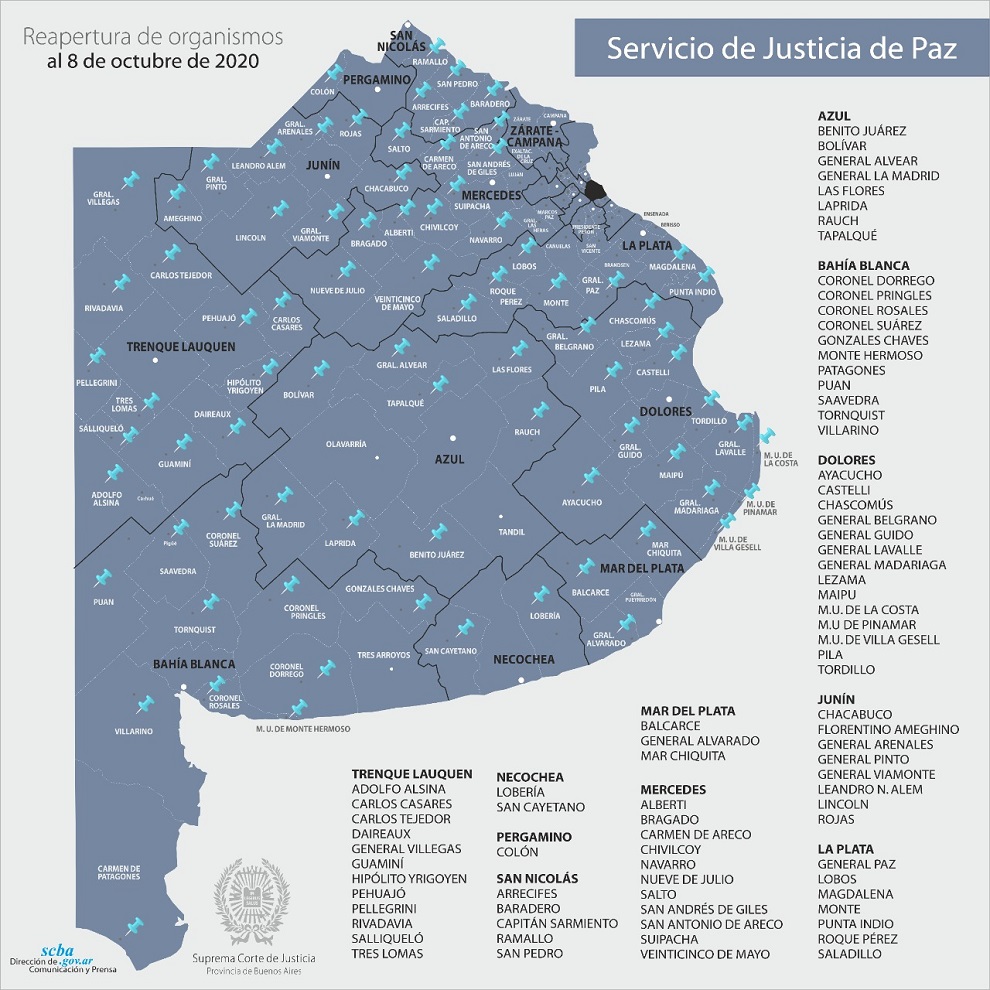 A través de la Resolución SPL Nº 56/20 la presidencia de la Suprema Corte de Justicia dispuso preventiva y provisionalmente la retrogradación del servicio pleno de justicia de Paz en los municipios de General Madariaga, General Viamonte, Leandro N. Alem y Saladillo y en la cabecera del Departamento Judicial de San Nicolás, a la situación de excepción reglada por Resoluciones SC Nº 386/20, Nº 480/20, sus ampliatorias y modificatorias.