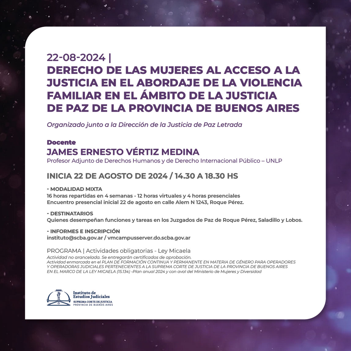 Actividad enmarcada en el PLAN DE FORMACIÓN CONTINUA Y PERMANENTE EN MATERIA DE GÉNERO PARA OPERADORES Y OPERADORAS JUDICIALES PERTENECIENTES A LA SUPREMA CORTE DE JUSTICIA DE LA PROVINCIA DE BUENOS AIRES EN EL MARCO DE LA LEY MICAELA (15.134) -Plan anual 2024 y con aval del Ministerio de Mujeres y Diversidad
