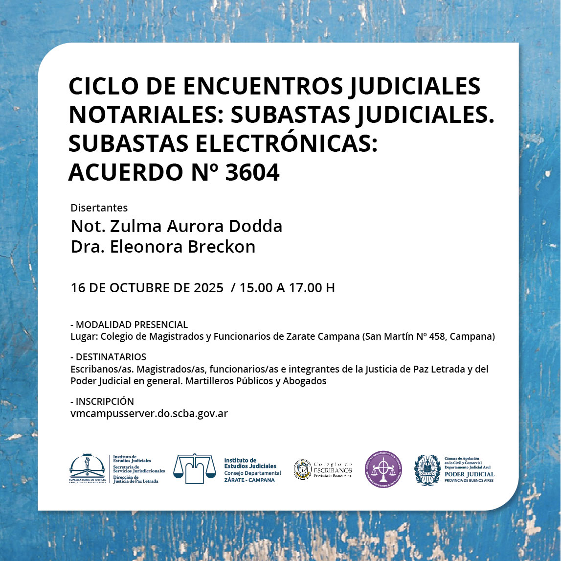 16-10-2025 | ZARATE CAMPANA - Ciclo de encuentros Judiciales Notariales: Subastas Judiciales. Subastas Electrónicas: Acuerdo Nº 3604