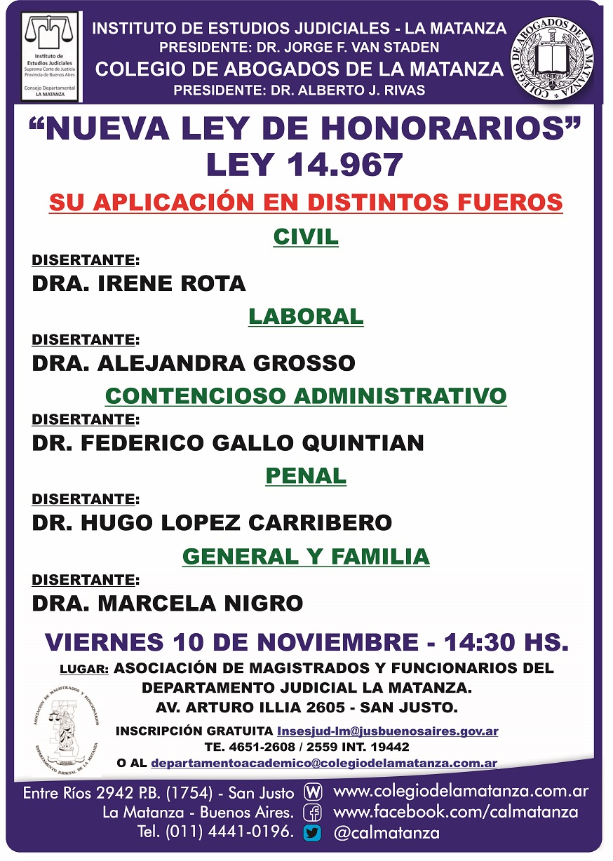10-11-2017 | LA MATANZA - Nueva ley de honorarios. Ley 14967.