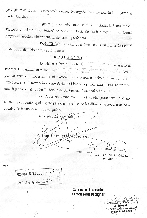 POR ELLO: el señor Presidente de la Suprema Corte de Justicia, en ejercicio de sus atribuciones, RESUELVE: 1.- Hacer saber al Perito ...... de la Asesoría Pericial del departamento judicial ...... que, por las razones expuestas en el exordio de la presente, deberá cesar en forma inmediata en su intervención como Perito de Lista en aquellos expedientes en trámite ante órganos de este Poder Judicial o de las Justicias Nacional o Federal. (ver resolución completa en archivos adjuntos)