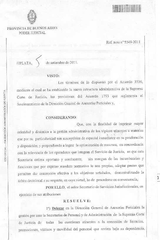 el Señor Secretario de Servicios Jurisdiccionales, en ejercicio de sus atribuciones RESUELVE: 1º) Delegar en la Dirección General de Asesorías Periciales la gestión por ante la Secretaría de Personal y de Administración de la Suprema Corte de Justicia de todas las cuestiones atinentes a la concesión de licencias, promociones, viáticos y movilidad del personal que revista bajo su dependencia, como asimismo, todos los requerimientos de provisión de insumos que fueren menester para su funcionamiento. 2º) regístrese, comuníquese y archívese. firma: Ricardo Miguel Ortiz, Secretario de la Secretaría de Servicios Jurisdicconales.