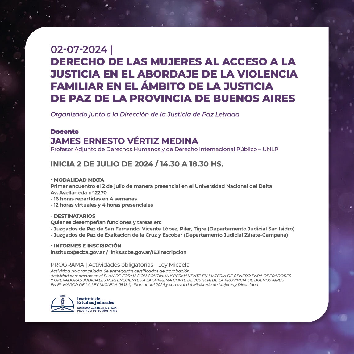 Actividad enmarcada en el PLAN DE FORMACIÓN CONTINUA Y PERMANENTE EN MATERIA DE GÉNERO PARA OPERADORES Y OPERADORAS JUDICIALES PERTENECIENTES A LA SUPREMA CORTE DE JUSTICIA DE LA PROVINCIA DE BUENOS AIRES EN EL MARCO DE LA LEY MICAELA (15.134) -Plan anual 2024 y con aval del Ministerio de Mujeres y Diversidad