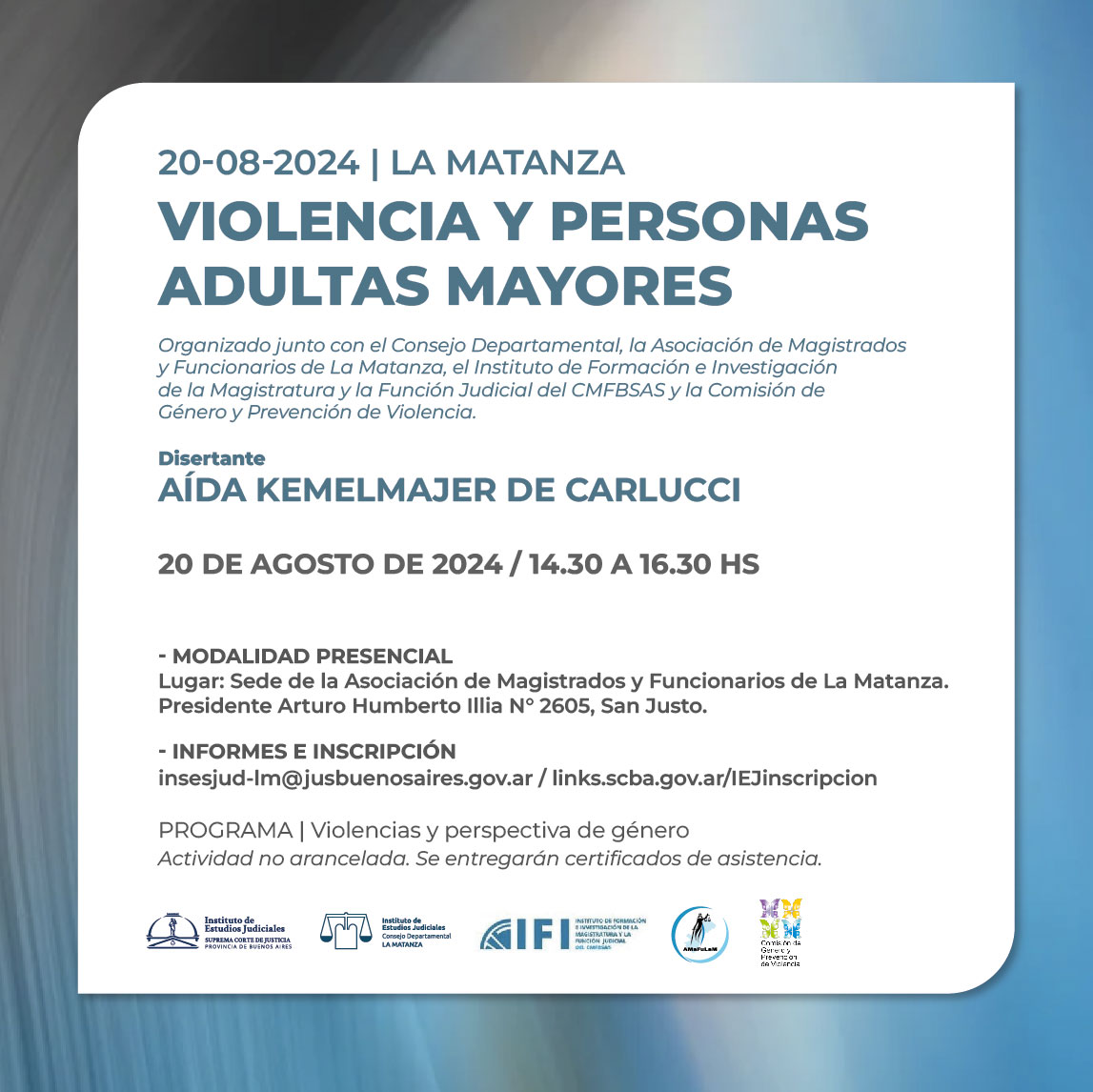 Organizado junto con Consejo Departamental de La Matanza , la Asociación de Magistrados y Funcionarios de La Matanza, el Instituto de Formación e Investigación de la Magistratura y Función Judicial del CMFBSAS y la Comisión de Género y Prevención de la Violencia