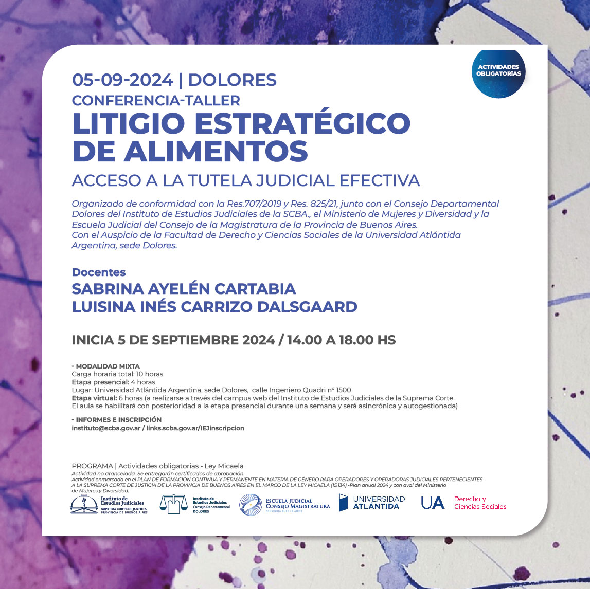 Organizado de conformidad con la Res.707/2019 y Res. 825/21, junto con el Consejo Departamental de Dolores, el Ministerio de Mujeres y Diversidad de la Provincia de Buenos Aires y la Escuela Judicial del Consejo de la Magistratura de la Provincia de Buenos Aires. Con el Auspicio de la Facultad de Derecho y Ciencias Sociales de la Universidad Atlántida Argentina, sede Dolores.