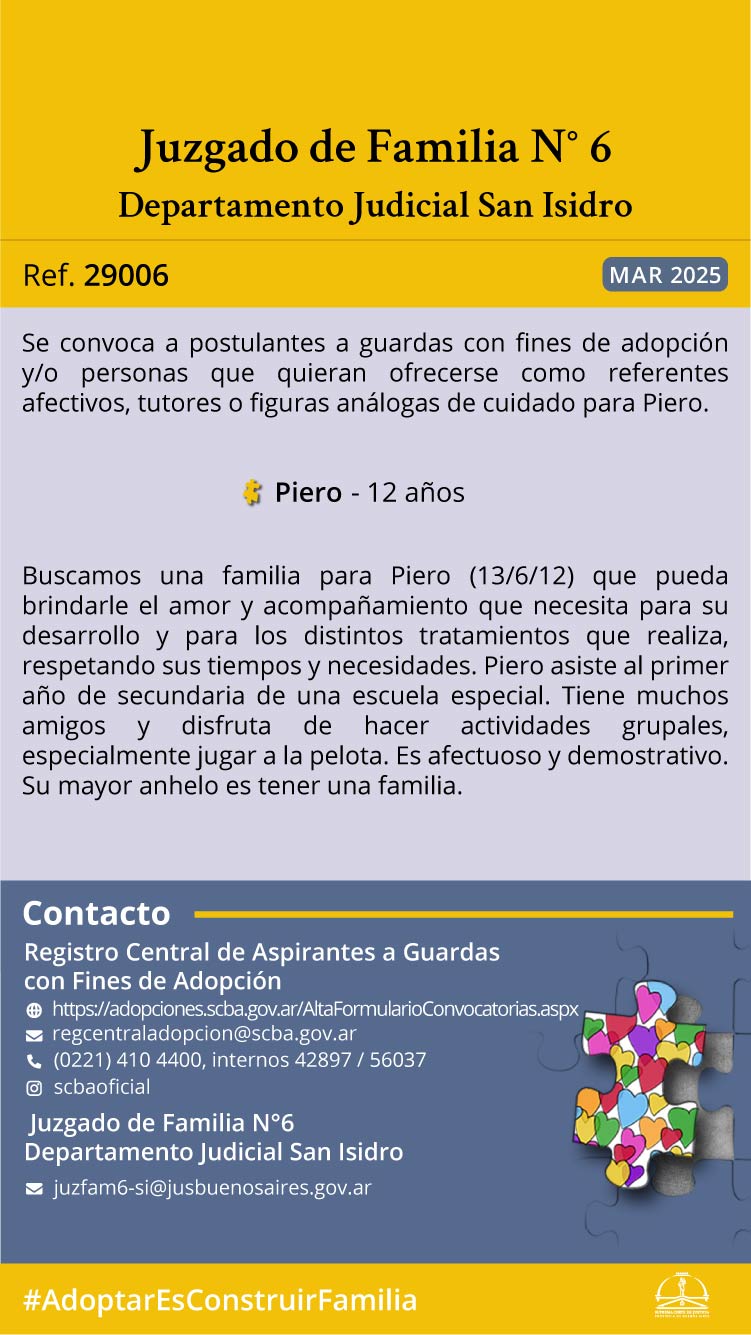 El Juzgado de Familia nº6 del Departamento Judicial San Isidro y el Registro Central de Aspirantes a Guardas con Fines de Adopción, convocan a postulantes a guardas con fines de adopción y/o a personas que quieran ofrecerse como referentes afectivos, tutores o figuras análogas de cuidado para Piero nacido el día 13 de junio de 2012.
