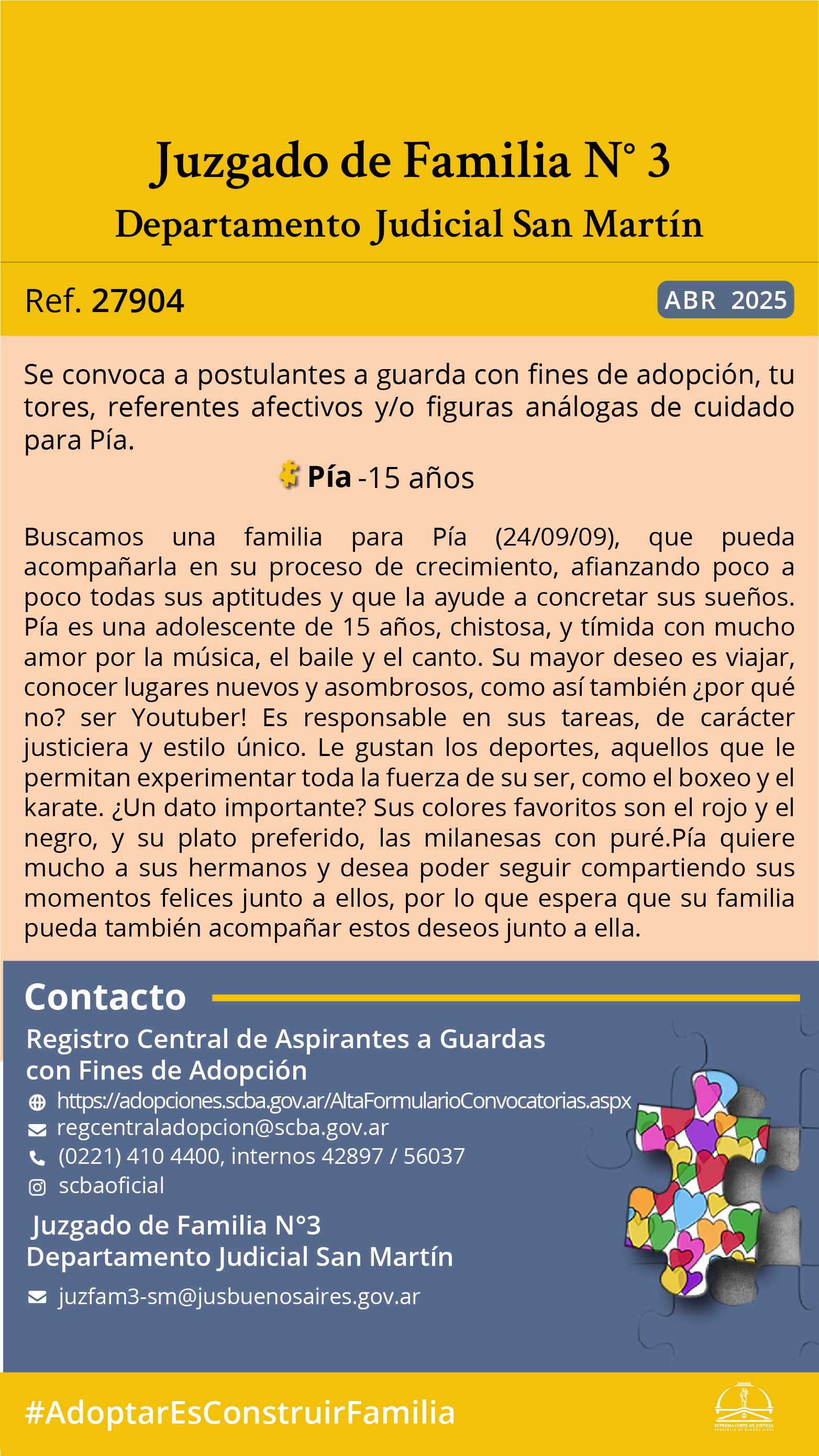 El Juzgado de Familia Nro.3 del Departamento Judicial San Martin y el Registro Central de Aspirantes a Guarda con Fines de Adopción convocan a postulantes a guarda con fines de adopción y/o personas que quieran ofrecerse como referentes afectivos, tutores o figuras análogas de cuidado para Pía, de 15 años de edad, nacida el 24 de septiembre de 2009.