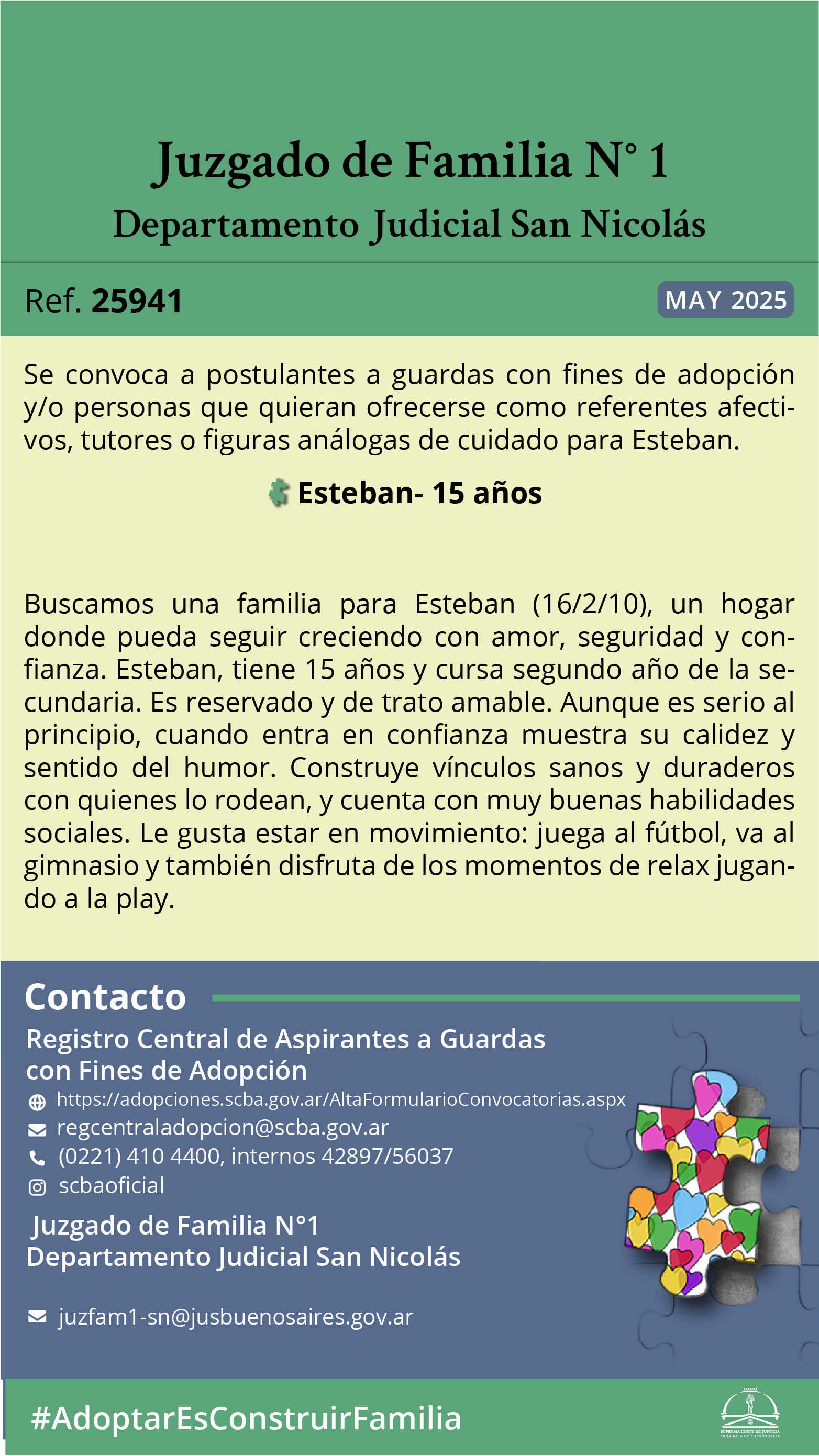 El Juzgado de Familia Nº1 del Departamento Judicial San Nicolas y el Registro Central de Aspirantes a Guarda con Fines de Adopción convocan a postulantes a guardas con fines de adopción y personas que quieran ofrecerse como referentes afectivos, tutores o figuras análogas de cuidado para Esteban, de 15 años de edad, nacido el día 16 de febrero de 2010.