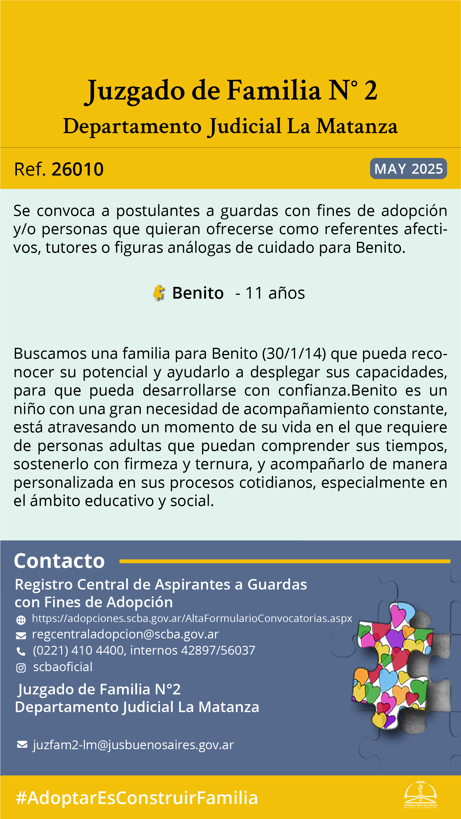 El Juzgado de Familia Nº2 del Departamento Judicial La Matanza, sito en calle Jujuy intersección Malabia, Piso 1 y el Registro Central de Aspirantes a Guarda con Fines de Adopción, convocan a postulantes a guardas con fines de adopción y/o personas que quieran ofrecerse como referentes afectivos, tutores o figuras análogas de cuidado para Benito, de 11 años de edad, nacido el día 30 de enero de 2014.