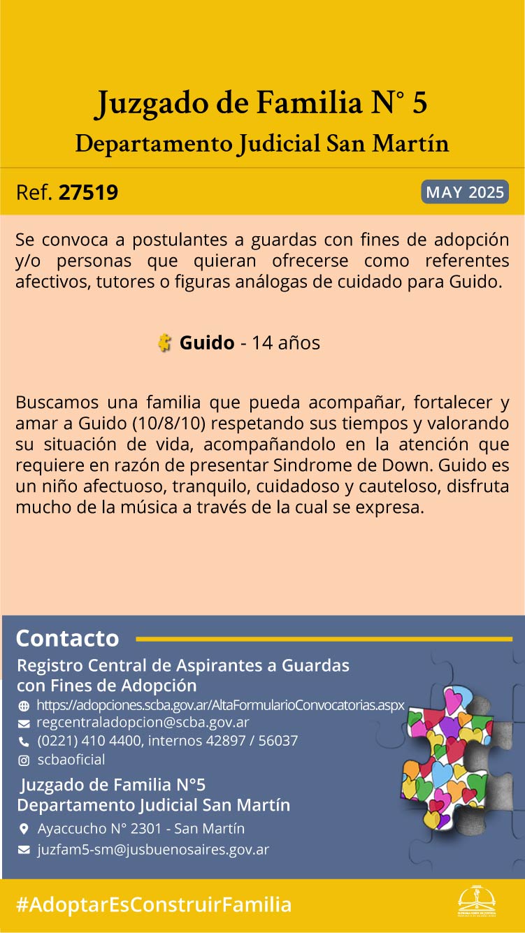 El Juzgado de Familia Nº5 del Departamento Judicial San Martín, sito en calle Ayacucho nº 2301 de San Martín y el Registro Central de Aspirantes a Guardas con Fines de Adopción, convocan a postulantes a guardas con fines de adopción y/o a personas que quieran ofrecerse como referentes afectivos, tutores o figuras análogas de cuidado para Guido nacido el día 10 de agosto de 2010, de 14 años de edad.