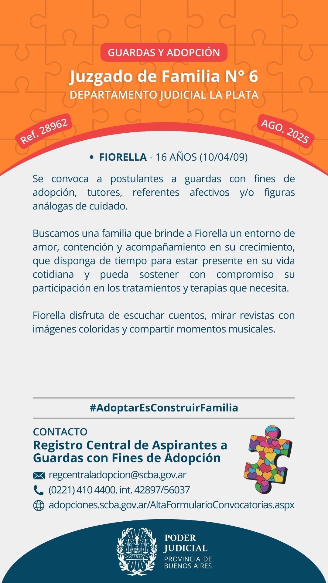 El Juzgado de Familia Nro. 6 del Departamento Judicial La Plata y el Registro Central de Aspirantes a Guarda con Fines de Adopción convocan a postulantes a guarda con fines de adopción y/o personas que quieran ofrecerse como referentes afectivos, tutores o figuras análogas de cuidado para Fiorella, de 16 años, nacida el 10 de abril de 2009.