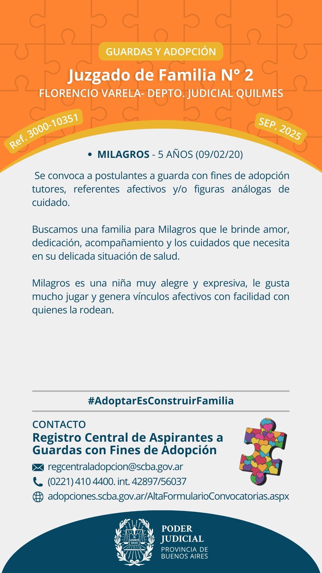 El Juzgado de Familia nº2 de Florencio Varela, Departamento Judicial Quilmes y el Registro Central de Aspirantes a Guarda con Fines de Adopción convocan a postulantes a guarda con fines de adopción y/o personas que quieran ofrecerse como referentes afectivos, tutores o figuras análogas de cuidado para Milagros de 5 años, nacida el día 9 de febrero de 2020.