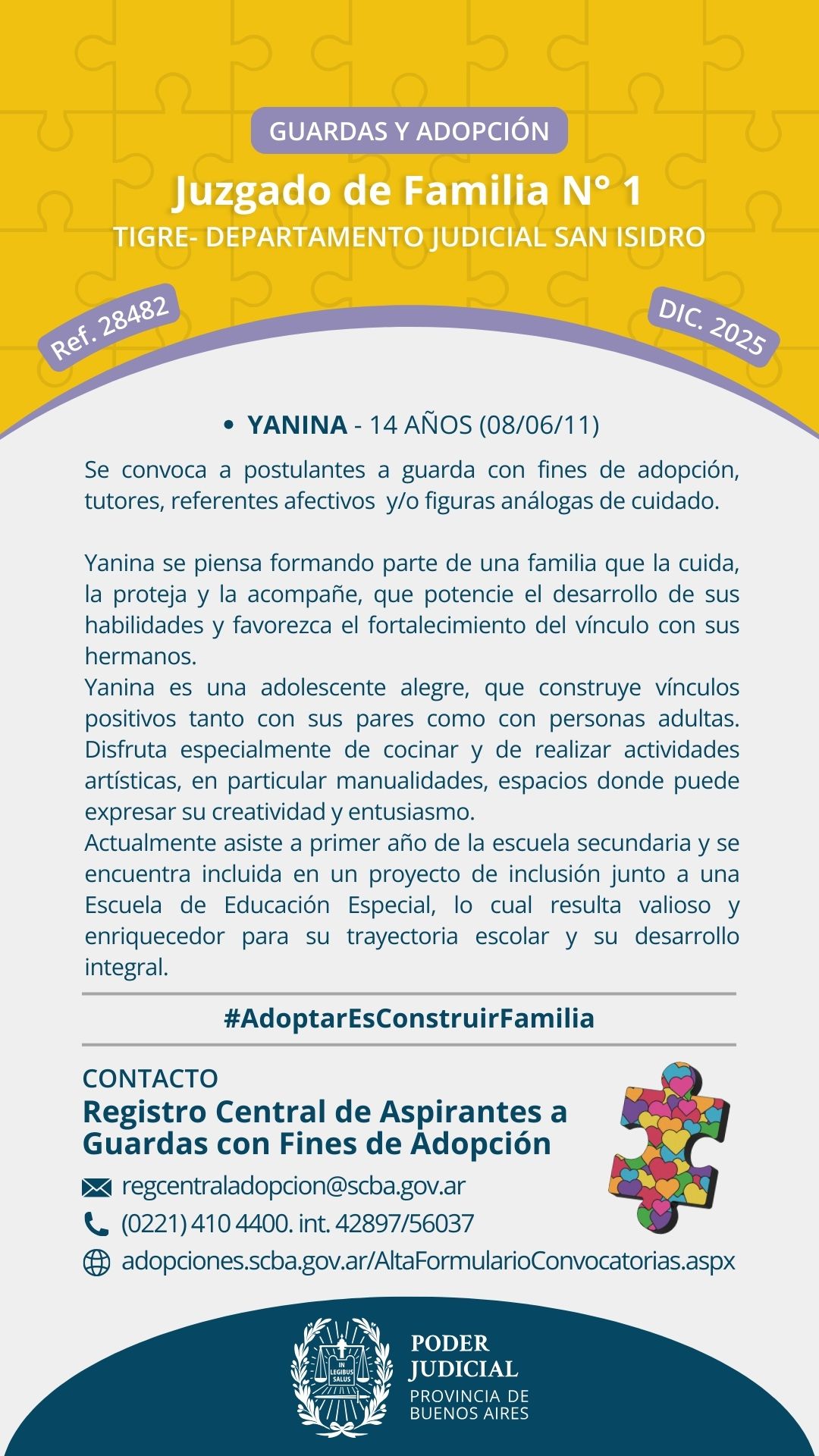 “Las búsquedas de familias por Convocatoria Pública son llamados a personas que se ofrecen para incorporar a sus familias a niños, niñas o adolescentes. Estas personas pueden, o no, estar inscriptas previamente en algún Registro de Adoptantes y tener domicilio en provincia de Buenos Aires o en el resto del país.