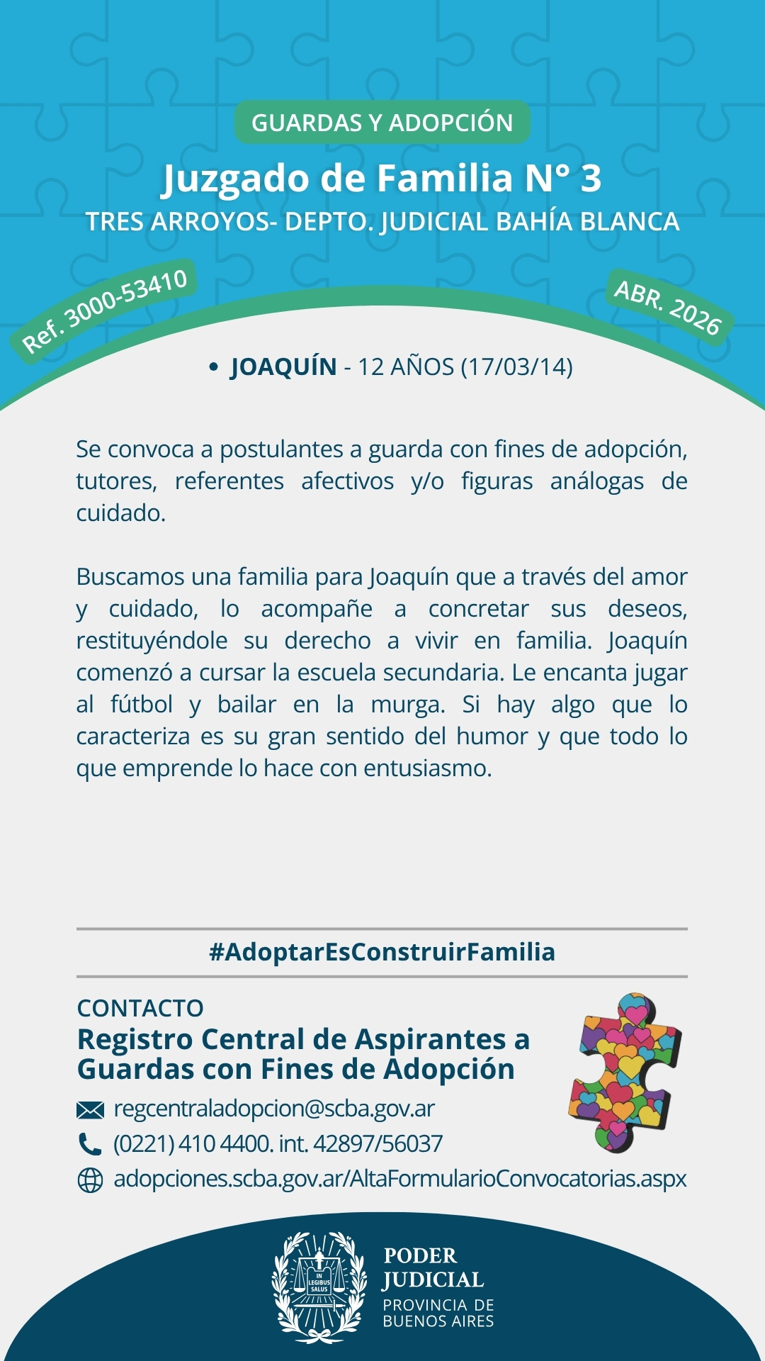 “Las búsquedas de familias por Convocatoria Pública son llamados a personas que se ofrecen para incorporar a sus familias a niños, niñas o adolescentes. Estas personas pueden, o no, estar inscriptas previamente en algún Registro de Adoptantes y tener domicilio en provincia de Buenos Aires o en el resto del país.