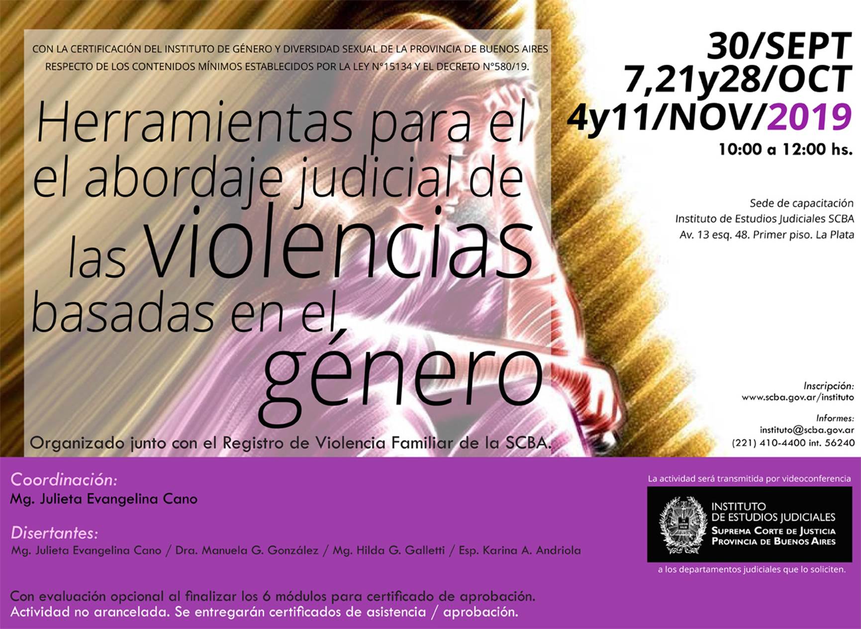 Coordinado por Julieta Evangelina Cano, la actividad cuenta con 6 módulos teórico-prácticos en donde se presentarán los principales ejes orientados a generar reflexión y debate para un adecuado abordaje judicial de situaciones de violencias de género.