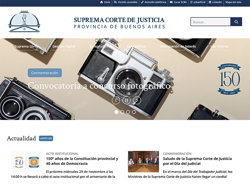 El día lunes 23 de octubre del corriente año se realizó la actualización de la página principal del sitio web oficial "scba.gov.ar". Su publicación incluyó, entre otras mejoras, la aplicación de los emblemas renovados de la Suprema Corte de Justicia y el Poder Judicial de la Provincia de Buenos Aires, en concordancia con lo dispuesto por el Tribunal a través del Acuerdo Nº 4122 del mes de septiembre de 2023.