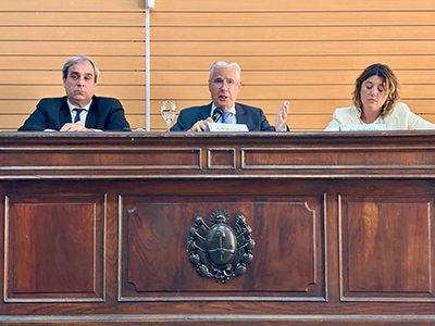 El Dr. Torres disertó sobre desarrollo sostenible y derecho ambiental, en una mesa en la que estuvo acompañado por el Presidente y la Vicepresidenta II de la Comisión de Funcionarios del Colegio de Magistrados y Funcionarios provincial (CMFBSAS), Norberto Gioia y Josefina Peláez, respectivamente.