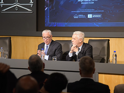 El vicepresidente de la Suprema Corte de Justicia, Sergio Gabriel Torres, junto al consultor senior de la oficina de UNESCO en Montevideo, Marcelo Figueredo, dieron apertura a la jornada: Herramientas de inteligencia artificial para la Administración de Justicia, realizada en el Salón Auditorio SCBA.