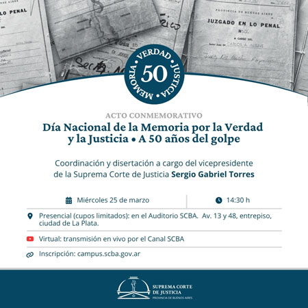 El 25 de marzo a las 14:30 h en el Salón Auditorio de la Suprema Corte de Justicia se llevará a cabo un acto conmemorativo por el Día Nacional de la Memoria por la Verdad y la Justicia, a 50 años del golpe de Estado, con transmisión en vivo del Canal SCBA.