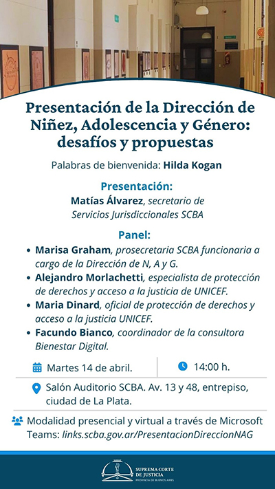 El martes 14 de abril a las 14 h. se llevará a cabo la actividad Presentación de la Dirección de Niñez, Adolescencia y Género (DNAG): desafíos y propuestas, en el Salón Auditorio SCBA ubicado en avenida 13 esquina 48, entrepiso, de la ciudad de La Plata.