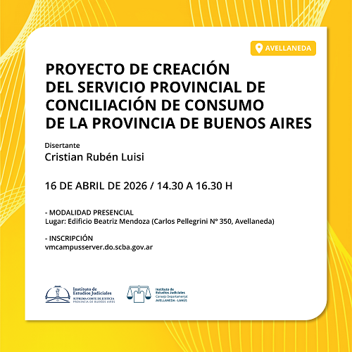 Jueves 16 de abril . Proyecto de creación del Servicio Provincial de conciliación de Consumo de la provincia de Buenos Aires Actividad a realizarse bajo la modalidad presencial, en el Edificio Beatriz Mendoza (Carlos Pellegrini Nº350, Avellaneda). Horario: 14.30 a 16.30 h Disertante: Cristian Rubén Luisi