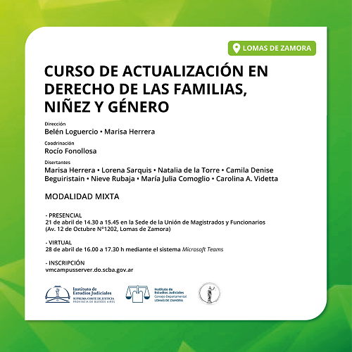 . Curso de actualización en Derecho de las Familias, Niñez y Género Actividad a realizarse bajo la modalidad mixta, con un encuentro presencial el 21 de abril, de 14:30 a 15:45 h, en la Sede de la Unión de Magistrados y Funcionarios (Av. 12 de Octubre Nº 1202, Lomas de Zamora) y un encuentro virtual, el 28 de abril, mediante el sistema Microsoft Teams. Horario: de 16:00 a 17:30 h Dirección: Belén Loguercio y Marisa Herrera Coordinación: Rocío Fonollosa Disertantes: Marisa Herrera, Lorena Sarquis, Natalia de la Torre, Camila Denise Beguiristain, Nieve Rubaja, María Julia Comoglio y Carolina A. Videtta