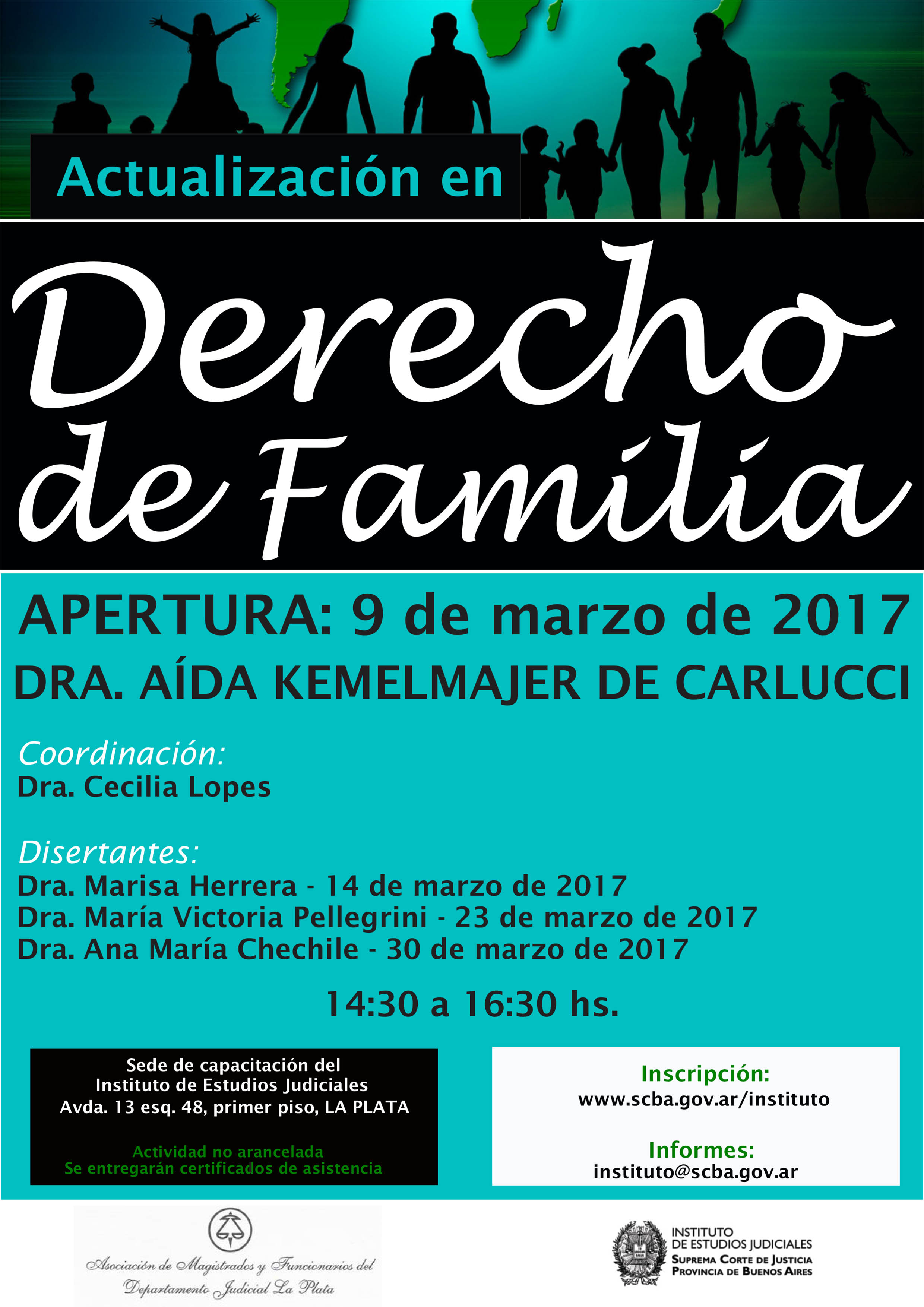 Organizado junto a la Asociación de Magistrados y Funcionarios del Departamento Judicial La Plata. Coordinación: Abog. Cecilia Lopes Disertantes: Dra. Aída Kemelmajer de Carlucci Dra. Marisa Herrera Dra. Maria Victoria Pellegrini Dra. Ana Maria Chechile Fechas: 9, 14, 23 y 30 de Marzo de 2017 Horario: 14.30 a 16.30 hs. Informes: Instituto@scba.gov.ar IMPORTANTE: Por razones de espacio, los cupos son limitados y se cubrirán por estricto orden de llegada. INSCRIPCIÓN >>