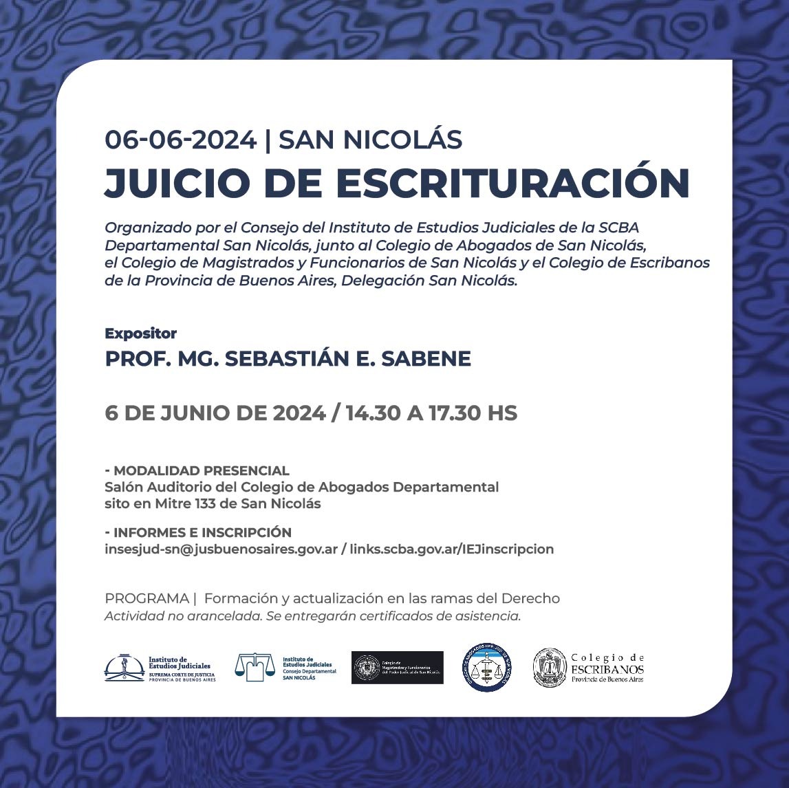 Organizado por el Consejo del Instituto de Estudios Judiciales de la SCBA Departamental San Nicolás, junto al Colegio de Abogados de San Nicolás, el Colegio de Magistrados y Funcionarios de San Nicolás y el Colegio de Escribanos de la Provincia de Buenos Aires, Delegación San Nicolás.-