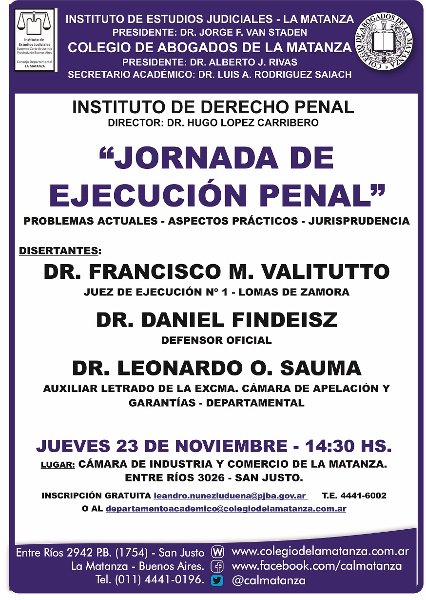 23-11-2017 | LA MATANZA - Jornada de ejecución penal. Problemas actuales. Aspectos prácticos. Jurisprudencia.