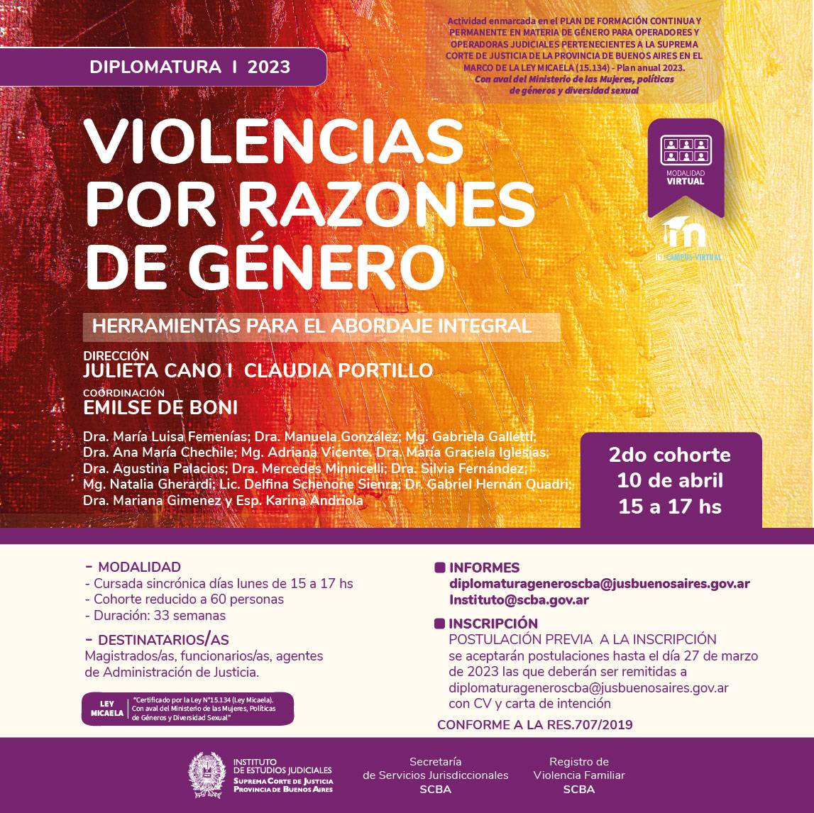 Actividad enmarcada en el PLAN DE FORMACIÓN CONTINUA Y PERMANENTE EN MATERIA DE GÉNERO PARA OPERADORES Y OPERADORAS JUDICIALES PERTENECIENTES A LA SUPREMA CORTE DE JUSTICIA DE LA PROVINCIA DE BUENOS AIRES EN EL MARCO DE LA LEY MICAELA (15.134) -Plan anual 2023 y con aval del Ministerio de las Mujeres, Políticas de géneros y Diversidad sexual