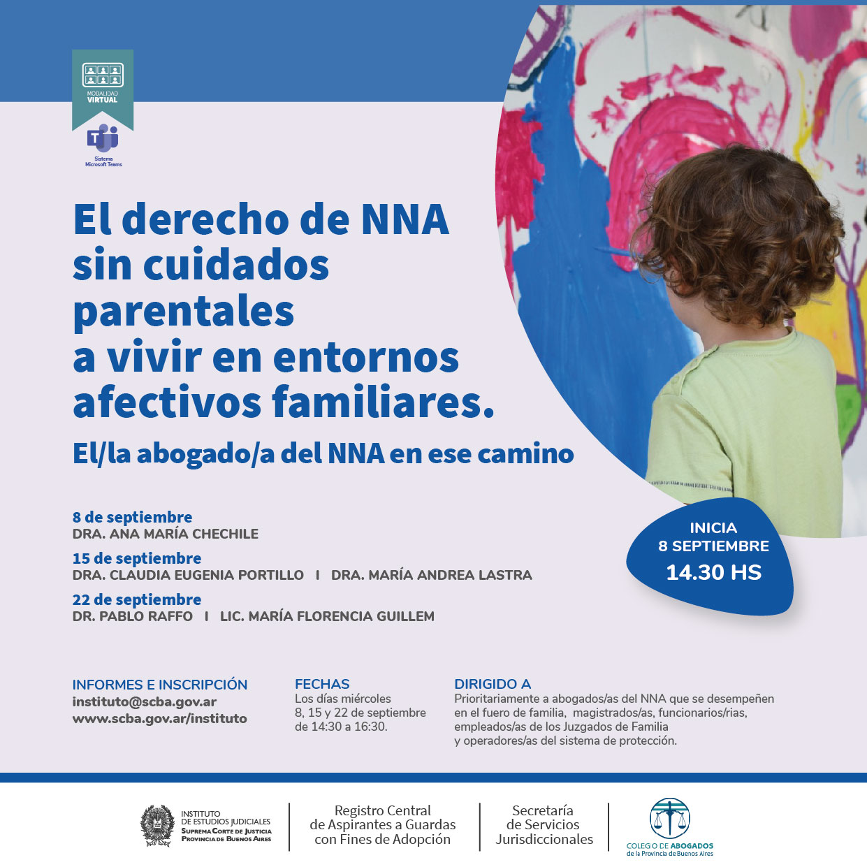 Dirigido a: prioritariamente a abogados/as del NNA que se desempeñen en el fuero de familia, magistrados/as, funcionarios/rias, empleados/as de los Juzgados de Familia y operadores/as del sistema de protección.