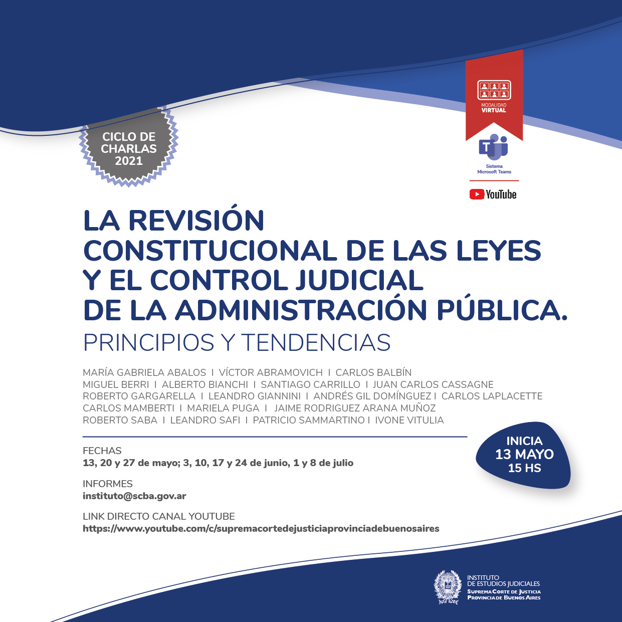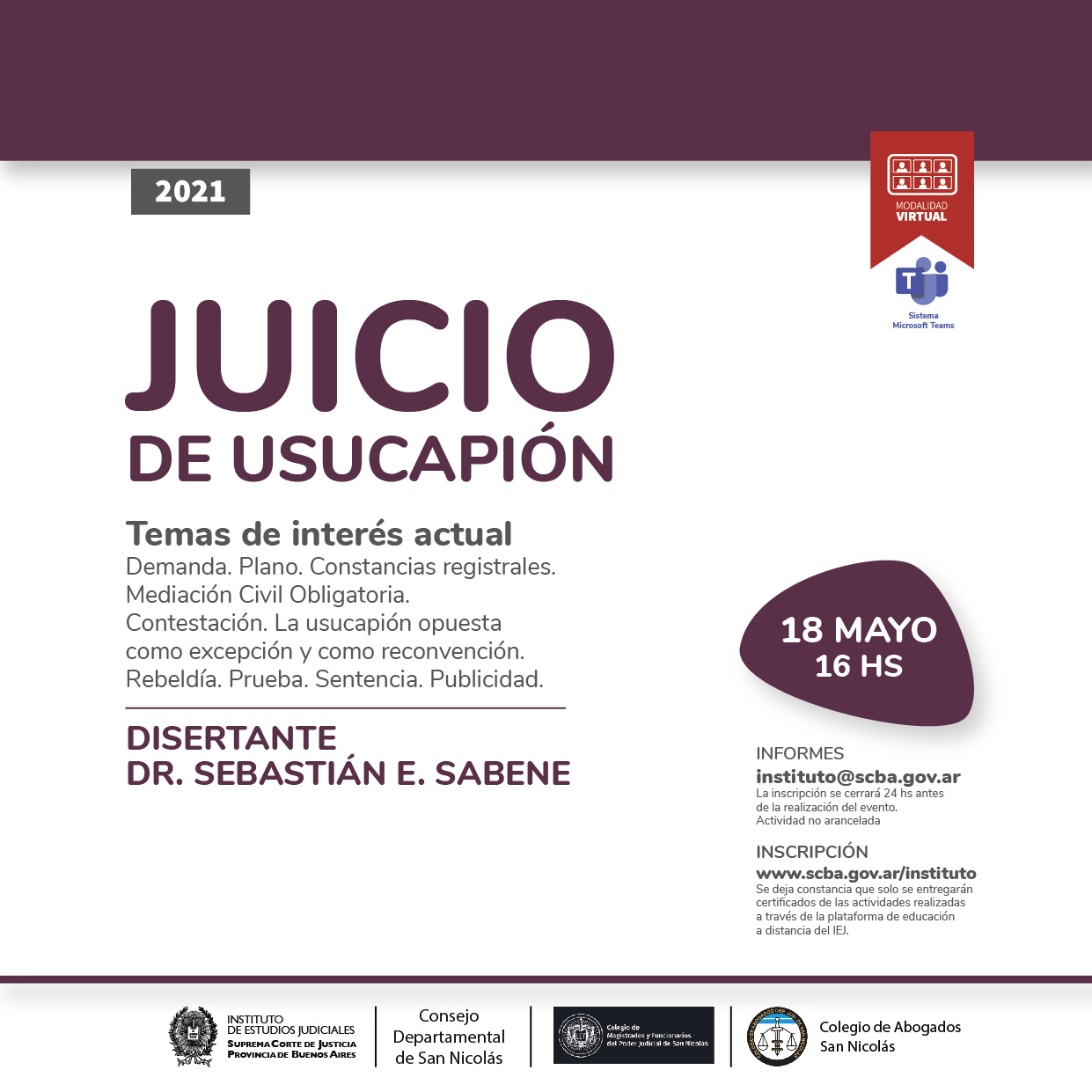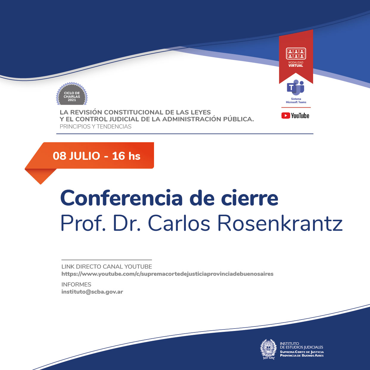 La actividad será realizada bajo la modalidad virtual mediante el sistema Microsoft Teams y transmitida en vivo por el canal de YouTube de la SCBA: