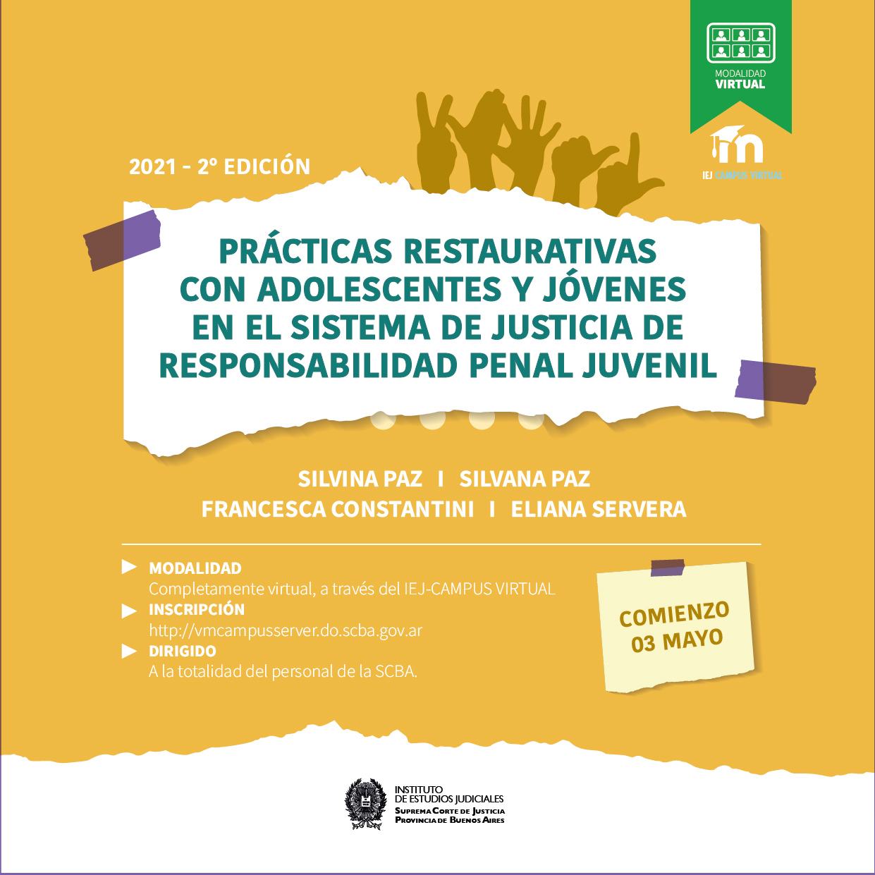 03-05-2021 | Prácticas Restaurativas con adolescentes y Jóvenes en el sistema de Justicia de responsabilidad penal juvenil . 2º Edición ( a distancia )