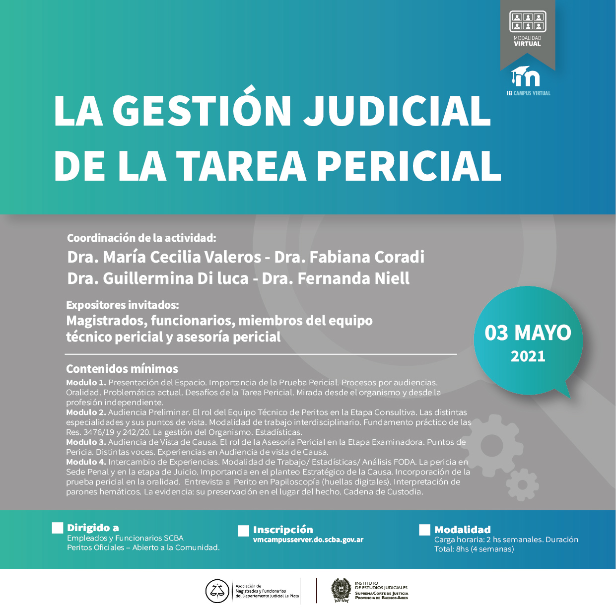 SE ENTREGARÁN CERTIFICADOS DE APROBACIÓN: Al finalizar la actividad, ud. deberá ingresar al Campus Virtual IEJ para completar un breve cuestionario y encuesta de satisfacción, a fin de obtener el certificado que acredita la aprobación del curso. http://vmcampusserver.do.scba.gov.ar/