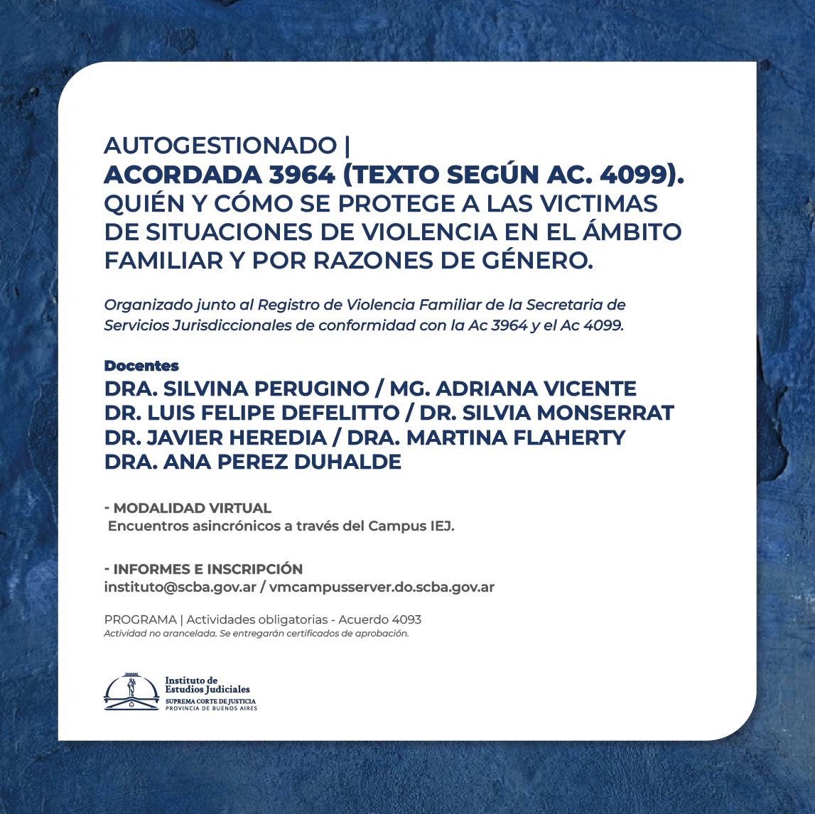 29-05-2024 | ACORDADA 3964 (TEXTO SEGÚN AC 4099) QUIÉN Y CÓMO SE PROTEGE A LAS VICTIMAS DE SITUACIONES DE VIOLENCIA EN EL ÁMBITO FAMILIAR Y POR RAZONES DE GÉNERO ( a distancia )