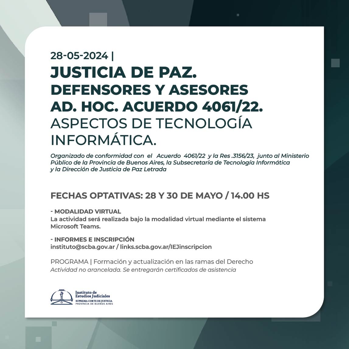 28-05-2024 | Justicia de Paz. Defensores y Asesores Ad Hoc. Acuerdo 4061/22. Aspectos de tecnologia informátcia ( a distancia )