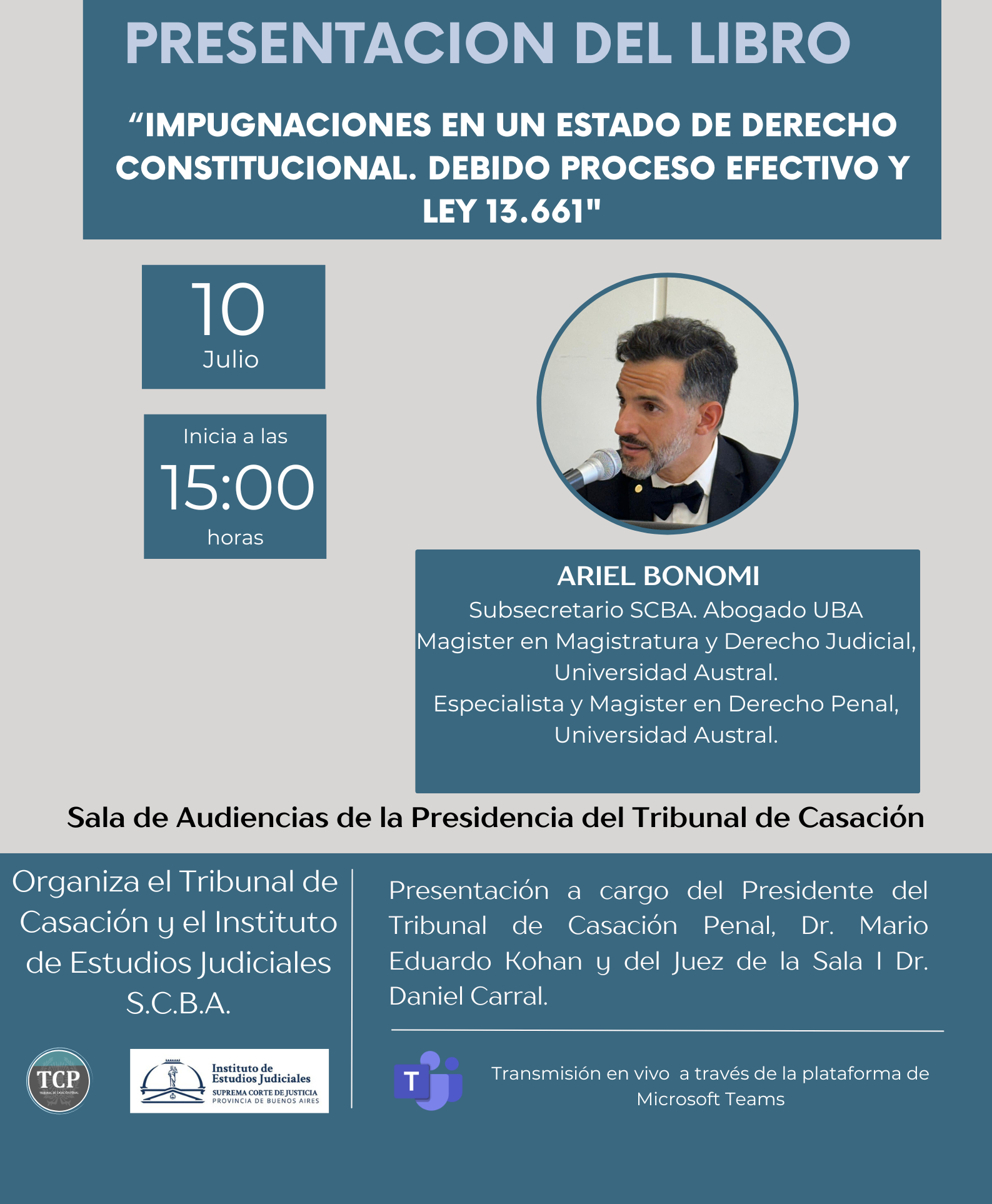 El 10 de julio se llevó a cabo en la Sala de Audiencias del Tribunal, la Presentación del libro "Impugnaciones en un Estado de Derecho. Debido proceso efectivo y Ley 13.661" a cargo de su autor, Dr. Ariel Bonomi, en el marco de las actividades de capacitación previstas para este año.Link de la conferencia: https://drive.google.com/file/d/1bF20EnxtsEyJEGQq4HUBPruX-ORYd_LR/view?usp=drive_link