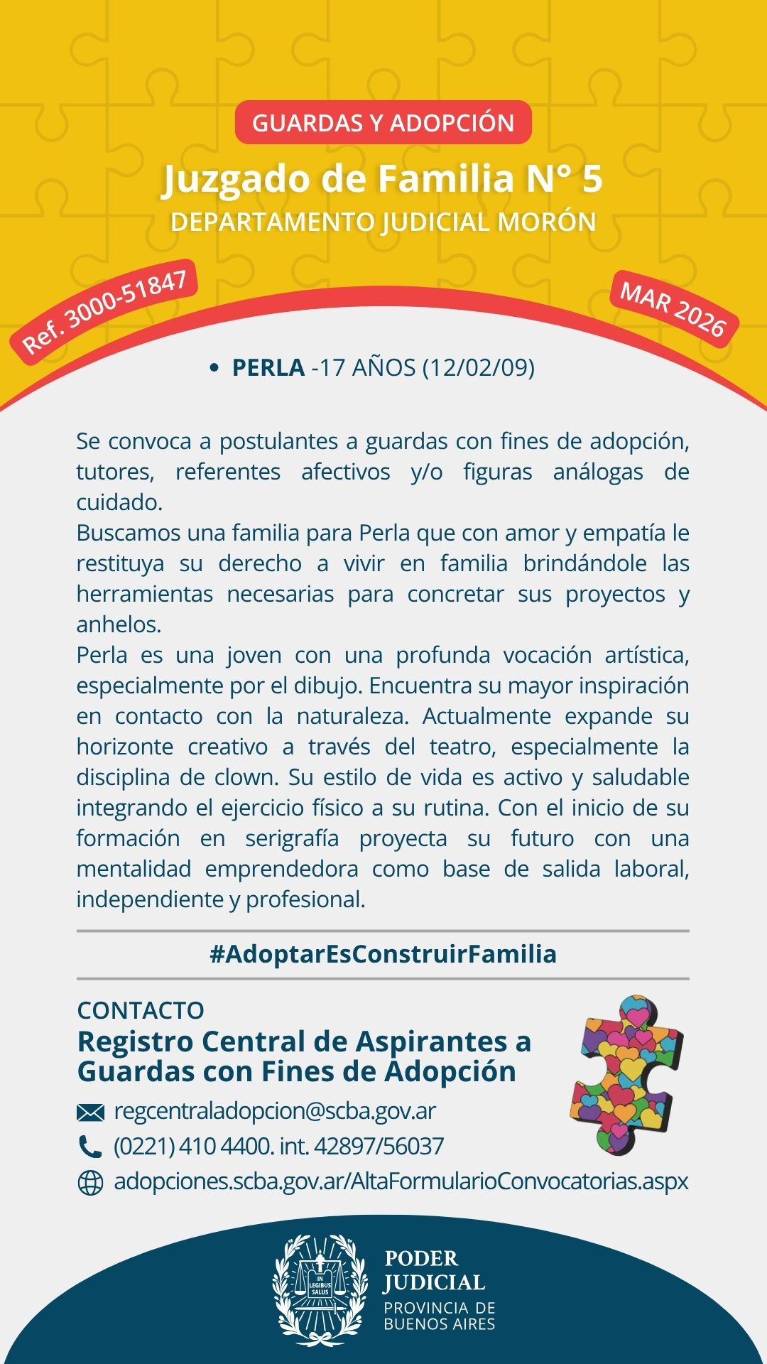 3000-51847-2025 - Perla POSTULANTES A GUARDA CON FINES DE ADOPCIÓN, TUTORES, REFERENTES AFECTIVOS Y/O FIGURAS ANÁLOGAS DE CUIDADO PARA PERLA El Juzgado de Familia nº5 del Departamento Judicial Morón y el Registro Central de Aspirantes a Guarda con Fines de Adopción convocan a postulantes a guarda con fines de adopción y/o personas que quieran ofrecerse como referentes afectivos, tutores o figuras análogas de cuidado para Perla de 17 años de edad, nacida el día 12 de febrero de 2009. Buscamos una familia para Perla que con amor y empatía le restituya su derecho a vivir en familia brindándole las herramientas necesarias para concretar sus proyectos y anhelos. Perla es una joven con una profunda vocación artística, especialmente por el dibujo. Encuentra su mayor inspiración en contacto con la naturaleza. Actualmente expande su horizonte creativo a través del teatro, especialmente la disciplina de clown. Su estilo de vida es activo y saludable integrando el ejercicio físico a su rutina. Con el inicio de su formación en serigrafía proyecta su futuro con una mentalidad emprendedora como base de salida laboral, independiente y profesional. Quienes decidan asumir el compromiso de acompañarla deberán completar el formulario que encontrarán en el siguiente sitio https://adopciones.scba.gov.ar/AltaFormularioConvocatorias.aspx De resultar necesario podrán comunicarse, previo a completar el formulario al citado Registro al número 0221-4104400, internos 42897/56037 o al correo regcentraladopcion@scba.gov.ar