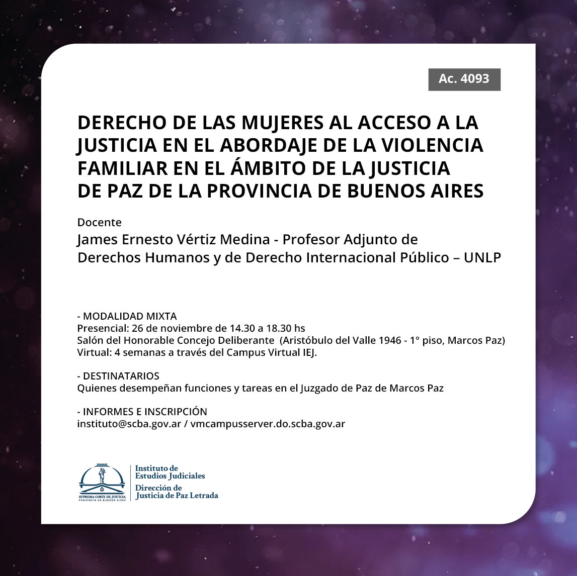 26-11-2024 | MARCOS PAZ - Derecho de las mujeres al acceso a la justicia en el abordaje de la violencia familiar en el ámbito de la Justicia de Paz de la Provincia de Buenos Aires
