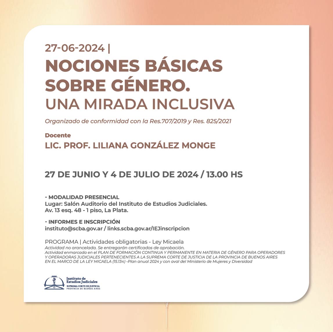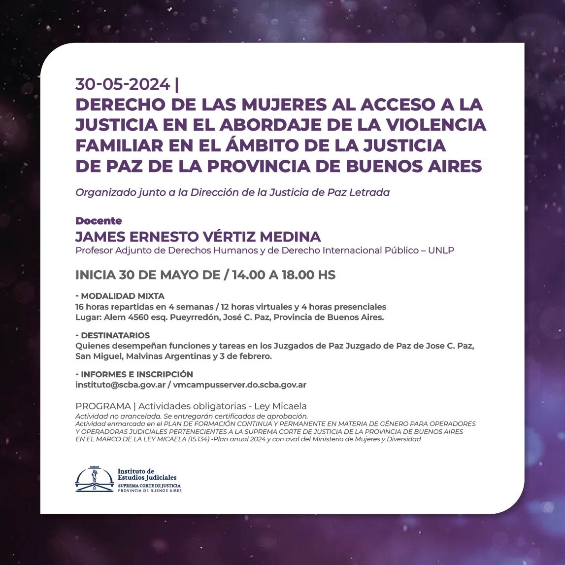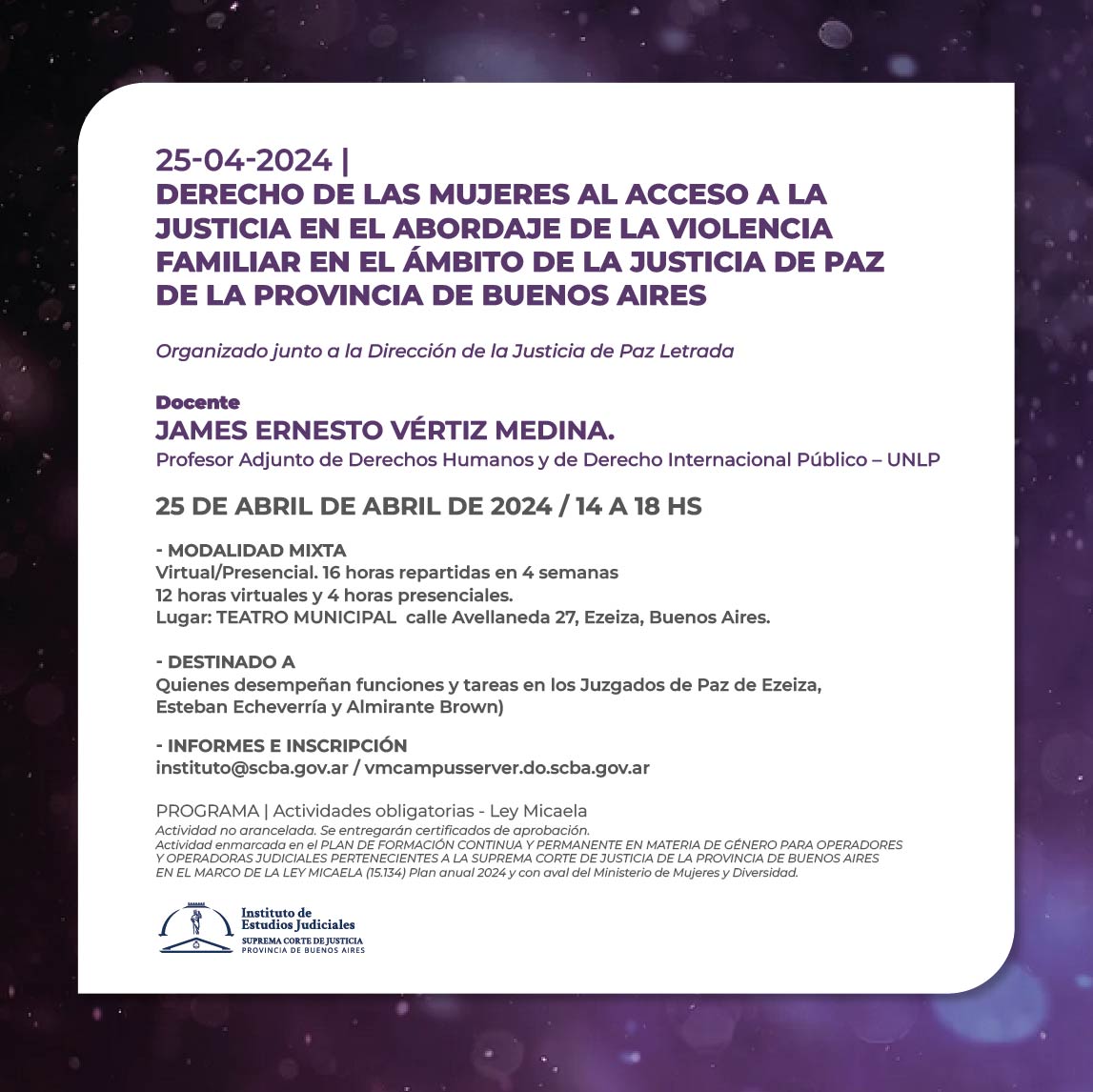 Actividad enmarcada en el PLAN DE FORMACIÓN CONTINUA Y PERMANENTE EN MATERIA DE GÉNERO PARA OPERADORES Y OPERADORAS JUDICIALES PERTENECIENTES A LA SUPREMA CORTE DE JUSTICIA DE LA PROVINCIA DE BUENOS AIRES EN EL MARCO DE LA LEY MICAELA (15.134) -Plan anual 2024 y con aval del Ministerio de Mujeres y Diversidad