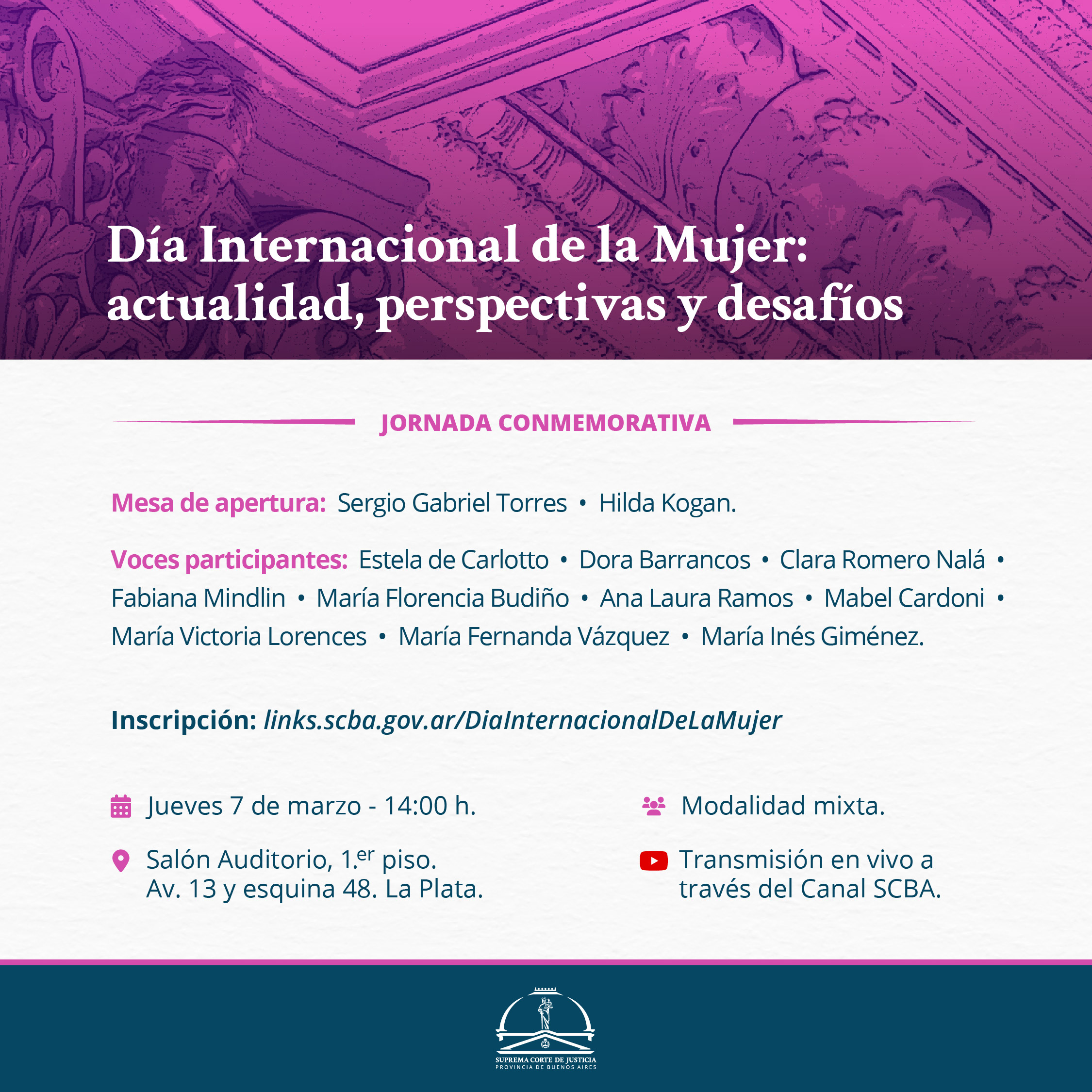 NOTA: La actividad será realizada bajo la modalidad mixta, presencial y virtual mediante transmisión en vivo por el canal de de la SCBA