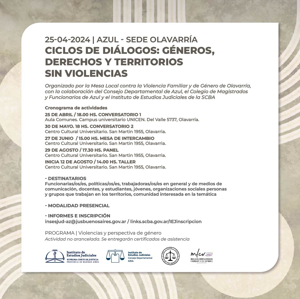 Organizado por la, Mesa Local contra la Violencia Familiar y de Género de Olavarría, con la colaboración del Consejo Departamental de Azul, el Colegio de Magistrados y Funcionarios de Azul y el Instituto de Estudios Judiciales de la SCBA