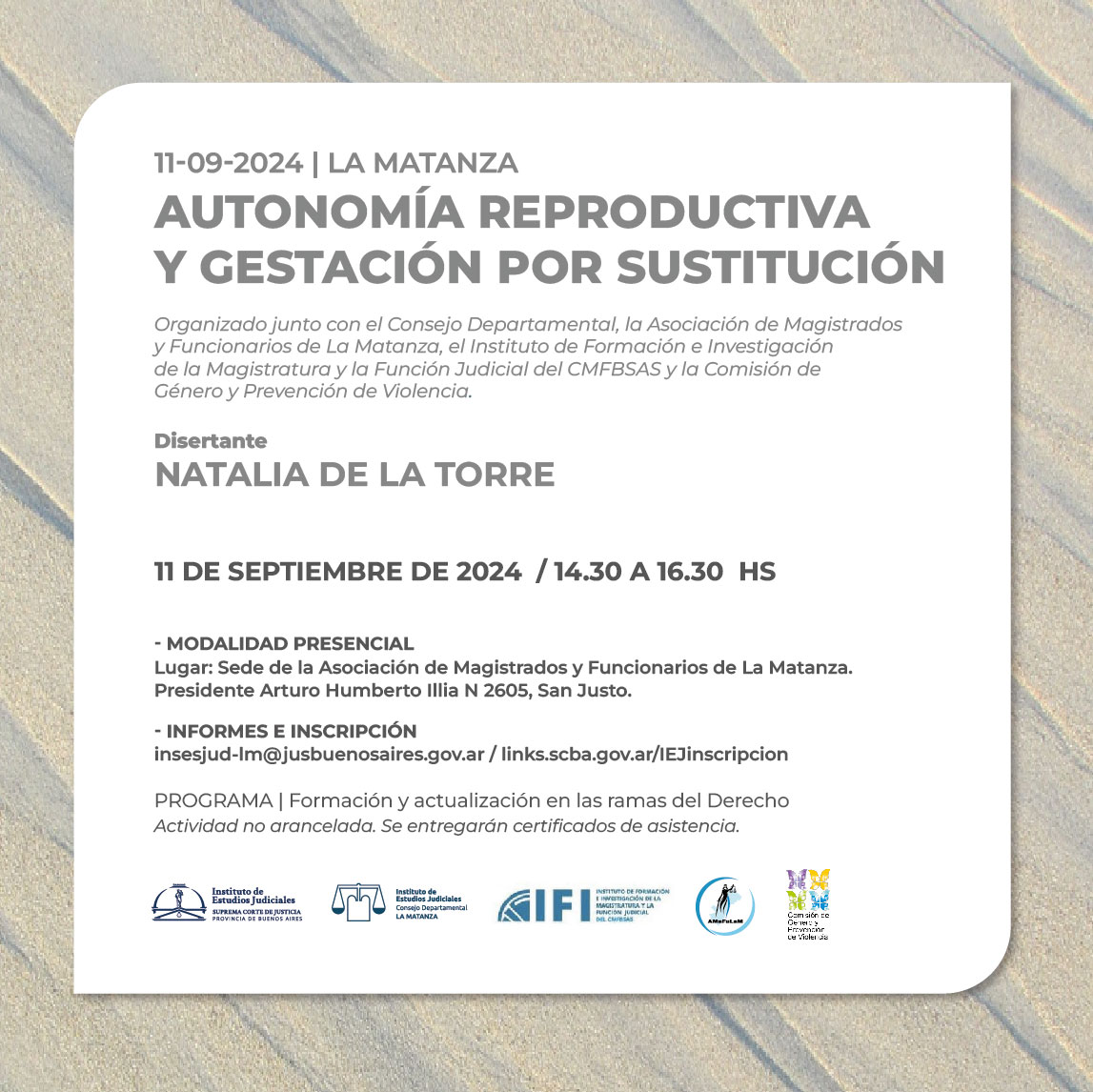 Organizado junto con Consejo Departamental de La Matanza , la Asociación de Magistrados y Funcionarios de La Matanza, el Instituto de Formación e Investigación de la Magistratura y Función Judicial del CMFBSAS y la Comisión de Género y Prevención de la Violencia