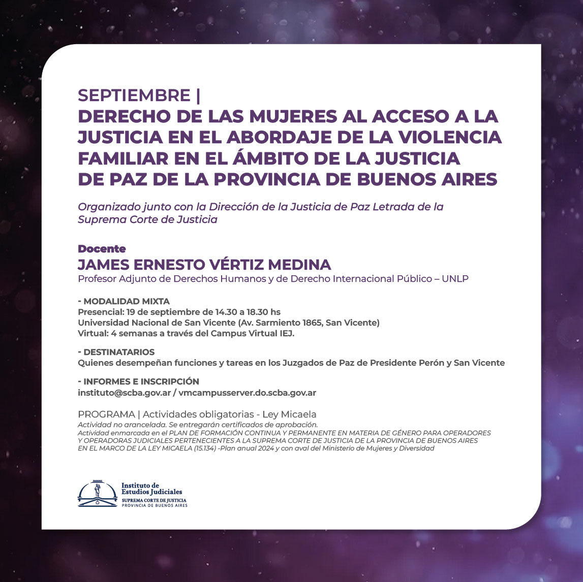 19-09-2024 | SAN VICENTE - Derecho de las mujeres al acceso a la Justicia en el abordaje de la violencia familiar en el ámbito de la Justicia de Paz de la Provincia de Buenos Aires
